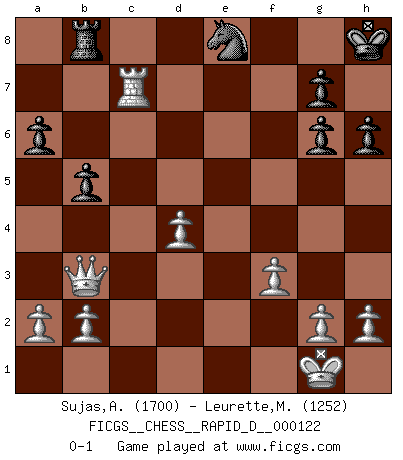 Last move : 0-1 2019 May 7 19:31:25 [Event "FICGS__CHESS__RAPID_D__000122"] [Site "FICGS"] [Date "2019.03.04"] [Round "1"] [White "Sujas,Abdulsamad"] [Black "Leurette,Marc-Antoine"] [Result "0-1"] [WhiteElo "1700"] [BlackElo "1252"] 1.d4 d5 2.c4 e6 3.Nc3 Nf6 4.Bg5 h6 5.Bh4 Be7 6.Nf3 b6 7.e3 c5 8.Bd3 cxd4 9.exd4 a6 10.O-O dxc4 11.Bxc4 b5 12.Be2 O-O 13.Ne5 Nd5 14.Bxe7 Qxe7 15.Nxd5 exd5 16.Bf3 Nd7 17.Nc6 Qd6 18.Bxd5 Qxd5 19.Ne7+ Kh8 20.Nxd5 Bb7 21.Ne3 Rae8 22.Rc1 Nf6 23.Rc7 Rb8 24.Qb3 Kg8 25.Nf5 Be4 26.Ne7+ Kh8 27.f3 Bg6 28.Nxg6+ fxg6 29.Re1 Rfe8 30.Rxe8+ Nxe8 0-1 This chess game has been lost on time (started : 2019.03.04 14:47:55) QGD : 4.Bg5 Kingside Castling by player White (move 10) Kingside Castling by player Black (move 12) Player Black won this chess game. Follow this game move after move (download)The essence of Chess is thinking about what Chess is. (David Bronstein) Das ganze Leben mit einer Ehefrau ist wie ein Endspiel mit ungleichfarbigen Läufern. (Viktor Kortschnoi) La partida mas dura de ganar es una partida ganada. (Emanuel Lasker) Avant la finale, les dieux ont créé le milieu de partie. (Tarrasch) No, no, you're not thinking; you're just being logical. (Niels Bohr)
