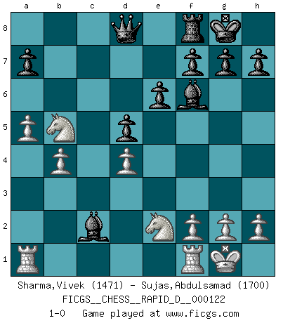 Last move : 1-0 2019 May 14 20:40:24 [Event "FICGS__CHESS__RAPID_D__000122"] [Site "FICGS"] [Date "2019.03.04"] [Round "1"] [White "Sharma,Vivek"] [Black "Sujas,Abdulsamad"] [Result "1-0"] [WhiteElo "1471"] [BlackElo "1700"] 1.e4 c6 2.d4 d5 3.exd5 cxd5 4.Nc3 Nc6 5.Bb5 Bf5 6.Nge2 e6 7.O-O Nf6 8.Bg5 Be7 9.Bxf6 Bxf6 10.Qd2 O-O 11.a4 Rc8 12.Bxc6 Rxc6 13.a5 b5 14.Nxb5 Rxc2 15.Qxc2 Bxc2 16.b4 1-0 This chess game has been lost on time (started : 2019.03.04 14:47:55) Caro-Kann : Exchange variation Kingside Castling by player White (move 7) Kingside Castling by player Black (move 10) Player White won this chess game. Follow this game move after move (download)It began to feel as though you were playing against Chess itself. - On playing against Robert Fischer. (Walter Shipman) Ohne ihre Erfolge schmälern zu wollen würde ich sagen Petrosian, Spassky und Karpov verdanken ihre Siege ihren Trainern - Boleslavsky, Bondarevsky und Furman. (Mikhail Moiseyevich Botvinik) Cuando me preguntan: -¿Cual es el secreto que te hace hacer mejores movidas que tus oponentes?, Yo respondo: Me da gusto que me pregunten eso, porque, como veran, hay una simple razón. Yo pienso mis propias movidas y dejo a mi oponente que el piense las suyas. (Alexander Alekhine) La solitude du joueur d'Echecs à l'approche du mat est semblable à celle du condamné. (Francis Szpiner) Creativity is allowing yourself to make mistakes. Art is knowing which ones to keep. (Scott Adams)