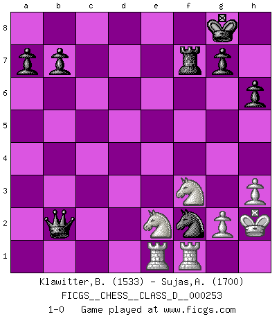 Last move : 1-0 2019 July 10 14:11:2 [Event "FICGS__CHESS__CLASS_D__000253"] [Site "FICGS"] [Date "2019.03.05"] [Round "1"] [White "Klawitter,Bernd"] [Black "Sujas,Abdulsamad"] [Result "1-0"] [WhiteElo "1533"] [BlackElo "1700"] 1.d4 d5 2.Bf4 Nf6 3.h3 c5 4.e3 Nc6 5.c3 e6 6.Nd2 Bd6 7.Qf3 O-O 8.Bd3 e5 9.dxe5 Nxe5 10.Bxe5 Bxe5 11.Rc1 Qa5 12.Bb1 Be6 13.Nb3 Qb6 14.Qe2 d4 15.cxd4 cxd4 16.exd4 Bxd4 17.Nxd4 Bxa2 18.Bxa2 Rae8 19.Bxf7+ Rxf7 20.Qxe8+ Nxe8 21.Nge2 Qb4+ 22.Kf1 h6 23.Kg1 Nd6 24.Nf3 Qxb2 25.Re1 Ne4 26.Kh2 Nxf2 27.Rhf1 1-0 This chess game has been lost on time (started : 2019.03.05 8:6:54) Queen's pawn, Mason variation Kingside Castling by player Black (move 7) Player White won this chess game. Follow this game move after move (download)Chess is so inspiring that I do not believe a good player is capable of having an evil thought during the game. (Wilhelm Steinitz) Es hat in meinem Leben Zeiten gegeben, in denen das Schachspiel, wenn nicht zum Lebenszweck, so doch zu einem regelrechten Lebensersatz geworden ist. Man fühlt sich in solchen Zeiten nicht so, als besäße man eine göttliche Gabe, sondern eher so, als sei man von ihr besessen. (Garry Kasparov) Una compensación adecuada por un sacrificio es tener una combinación sólida que conduce a una posición ganadora; una compensación adecuada por una metida de pata es dejar a tu oponente arrebatar una derrota de las fauces de la victoria. (Bruce A. Moon) Karpov est une pièce de musée. (Garry Kasparov) Always two there are. No more no less. A master, and an apprentice. (Master Yoda in Star Wars ep.1)