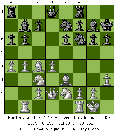 Last move : 0-1 2019 May 9 7:45:20 [Event "FICGS__CHESS__CLASS_D__000253"] [Site "FICGS"] [Date "2019.03.05"] [Round "1"] [White "Master,Fatih"] [Black "Klawitter,Bernd"] [Result "0-1"] [WhiteElo "1446"] [BlackElo "1533"] 1.e4 d5 2.exd5 Qxd5 3.Nc3 Qd8 4.d4 Nf6 5.Bc4 g6 6.Nge2 Bg7 7.O-O O-O 8.h3 e6 9.Bg5 Nc6 10.a3 h6 11.Be3 a6 12.a4 b6 13.Rb1 Ne7 14.Qd2 Kh7 15.b4 Bb7 0-1 Scandinavian (centre counter) defense Kingside Castling by player White (move 7) Kingside Castling by player Black (move 7) Player Black won this chess game. Follow this game move after move (download)Chess is 99 percent tactics. (Teichmann) Nie in meinem Leben habe ich die französische Verteidigung gespielt, welche die Stumpfsinnigste von allen ist. (Wilhelm Steinitz) Yo considero que Fischer es uno de los expertos mas grandes de aperturas de siempre. (Keith Hayward) Je menace de comprendre la position. (Anonyme) Perhaps the current trend of many chess professionals taking up the more lucrative pastime of poker is not a wholly negative one. It may not be too late for humans to relearn how to take risks in order to innovate and thereby maintain the advanced lifestyles we enjoy. And if it takes a poker-playing supercomputer to remind us that we can't enjoy the rewards without taking the risks, so be it. (The Chess Master and the Computer, by Garry Kasparov - 2010)