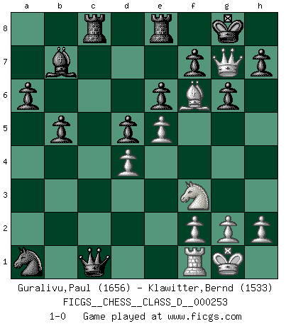 Last move : 1-0 2019 March 21 8:51:24 [Event "FICGS__CHESS__CLASS_D__000253"] [Site "FICGS"] [Date "2019.03.05"] [Round "1"] [White "Guralivu,Paul"] [Black "Klawitter,Bernd"] [Result "1-0"] [WhiteElo "1656"] [BlackElo "1533"] 1.c4 c6 2.Nc3 e6 3.e3 d5 4.d4 Nf6 5.Nf3 Be7 6.Bd3 O-O 7.O-O dxc4 8.Bxc4 b5 9.Bd3 Bb7 10.e4 a6 11.e5 Nd5 12.Nxd5 cxd5 13.Bc2 Nc6 14.a3 Rc8 15.Qd3 g6 16.Bh6 Re8 17.b4 Bxb4 18.axb4 Nxb4 19.Qd2 Nxc2 20.Bg5 Qc7 21.Bf6 Nxa1 22.Qh6 Qc1 23.Qg7+ 1-0 English : Caro-Kann defensive system Kingside Castling by player Black (move 6) Kingside Castling by player White (move 7) Player White won this chess game. Follow this game move after move (download)The older I grow, the more I value Pawns. (Keres) Alle offensichtlichen Züge sehen nach dem Spiel in der Analyse verdächtig aus. (Viktor Kortschnoi) Los libros de Ajedrez deben de usarse igual como usamos los anteojos: para mejorar la vista, aunque algunos jugadores los quieren usar como si ellos les otorgaran la vision. (José Raúl Capablanca) Le joueur d'Echecs qui veut atteindre le top est obligé de développer son propre credo créatif. Alexeï Stepanovicth Souétine. Il est facile d'écrire des livres ! Ce qui est difficile, c'est de jouer ! (Alexeï Stepanovicth Souétine) I live to kill Traxler counterattack. (Ilmars Cirulis)