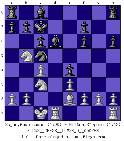 Last move : 1-0 2019 March 17 20:56:47 [Event "FICGS__CHESS__CLASS_D__000253"] [Site "FICGS"] [Date "2019.03.05"] [Round "1"] [White "Sujas,Abdulsamad"] [Black "Hilton,Stephen"] [Result "1-0"] [WhiteElo "1700"] [BlackElo "1713"] 1.d4 d6 2.c4 Nf6 3.Nc3 e5 4.dxe5 dxe5 5.Qxd8+ Kxd8 6.Bg5 c6 7.Nf3 Nbd7 8.O-O-O Kc7 9.e3 Bd6 10.Be2 h6 11.Bh4 e4 12.Nd4 Nc5 13.Bxf6 gxf6 14.Ndb5+ 1-0 Old Indian defense Queenside Castling by player White (move 8) Player White won this chess game. Follow this game move after move (download)No other master has such a terrific will to win. At the board he radiates danger, and even the strongest opponents tend to freeze, like rabbits when they smell a panther. Even his weaknesses are dangerous. As white, his opening game is predictable - you can make plans against it - but so strong that your plans almost never work. In the middle game his precision and invention are fabulous, and in the end game you simply cannot beat him. (Anonymous German Expert) Nicht daß Diemer aus Opportunismus Mitglied der NSDAP geworden wäre. Er war ein Fanatiker, in allem, was er tat. (Hans Ree) El Ajedrez tiene tanto misterio como las mujeres. (Purdy) Aux échecs, l'amour-propre est satisfait quand on remporte la victoire, mais il n'y a pas de honte à être battu. (Benjamin Franklin) History is the quarrels of popes and kings, with wars or pestilences in every page; the men all so good for nothing, and hardly any women at all. (Jane Austen)