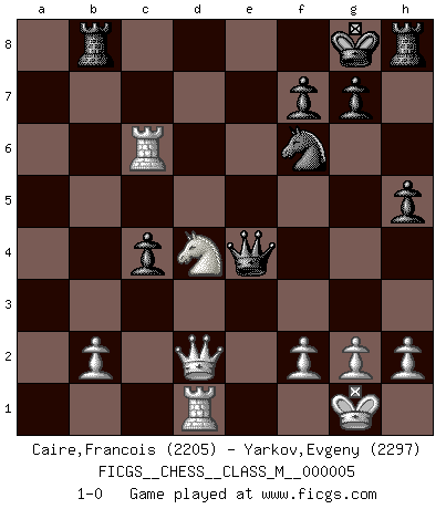 Last move : 1-0 2007 January 21 11:6:3 [Event "FICGS__CHESS__CLASS_M__000005"] [Site "FICGS"] [Date "2006.06.13"] [Round "1"] [White "Caire,Francois"] [Black "Yarkov,Evgeny"] [Result "1-0"] [WhiteElo "2205"] [BlackElo "2297"] 1.d4 Nf6 2.c4 e6 3.Nf3 d5 4.Nc3 c6 5.e3 a6 6.Bd3 dxc4 7.Bxc4 b5 8.Bb3 c5 9.O-O Bb7 10.Qe2 Nbd7 11.Rd1 Qb8 12.d5 exd5 13.e4 dxe4 14.Bc2 Be7 15.Nxe4 Nxe4 16.Bxe4 Nf6 17.Bf4 Qc8 18.Bxb7 Qxb7 19.Bd6 Kf8 20.Qc2 c4 21.Bxe7+ Qxe7 22.a4 Rb8 23.Nd4 Qe4 24.Qd2 bxa4 25.Rxa4 h5 26.Rxa6 Kg8 27.Rc6 1-0 This chess game has been lost on time (started : 2006.06.13 17:46:6) Queen's pawn game Kingside Castling by player White (move 9) Player White won this chess game. Follow this game move after move (download)The hallmark of the artist is simplicity. (Larry Evans) Bis zum Jahr 1971 verlief in meiner Schachkariere alles glatt. Dieses dramatische Match [Fischer-Taimanov 6:0] machte mein Leben zur Hölle. (Mark Taimanov) No hay otro maestro que tenga una voluntad terrífica de ganar. Al tablero, el irradía peligro y aún los oponentes mas fuertes tienden a congelarse como liebres cuando olfatean a una pantera. Aún sus debilidades son peligrosas. Con las blancas, su juego de apertura es predecible - te es posible hacer planes en su contra - pero es tan fuerte que tus planes casi nunca funcionan. En el juego medio, su precisión e invención son fabulosas y en finales, tú simplemente no le puedes vencer. (Experto Alemán anónimo) Je menace de comprendre la position. (Anonyme) The quality of decision is like the well-timed swoop of a falcon which enables it to strike and destroy its victim. (Sun Tzu)