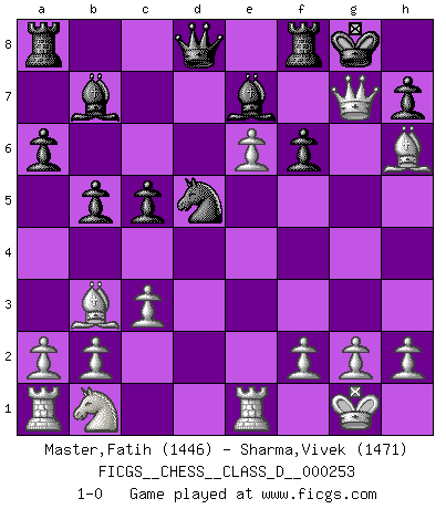 Last move : 1-0 2019 March 11 12:6:53 [Event "FICGS__CHESS__CLASS_D__000253"] [Site "FICGS"] [Date "2019.03.05"] [Round "1"] [White "Master,Fatih"] [Black "Sharma,Vivek"] [Result "1-0"] [WhiteElo "1446"] [BlackElo "1471"] 1.e4 e5 2.Nf3 Nc6 3.Bb5 Be7 4.O-O a6 5.Ba4 Nf6 6.Re1 O-O 7.c3 b5 8.Bb3 Bb7 9.d4 d5 10.exd5 Nxd5 11.Nxe5 Nxe5 12.dxe5 c5 13.Qg4 f6 14.Bh6 Rf7 15.e6 Rf8 16.Qxg7+ 1-0 Ruy Lopez : Lucena defense Kingside Castling by player White (move 4) Kingside Castling by player Black (move 6) Player White won this chess game. Follow this game move after move (download)Before the endgame, the Gods have placed the middle game. (Siegbert Tarrasch) Es ist peinlich, dass ich nie Weltmeister wurde. Es wäre leicht, Leonid Breschnjew als Ursache vorzuschieben, dessen Apparat den Vorzeigekommunisten Anatoli Karpow in allem unterstützte. Aber Garri Kasparow zum Beispiel, der ebenfalls von den Sowjets unerwünscht war, hat trotz der Widerstände den WM-Titel erobert. (Viktor Kortschnoi) Si el ingenio solamente fuese necesario para lucirse, las mujeres serían las mejores jugadoras de Ajedrez del mundo. (Albin) Le profane ne songe pas à la somme de jouissance dont il se prive, qui méconnaît ce jeu aux ressources aussi variées que passionnantes. (Jean-Marie Jeanton-Lamarche) We need strong personalities and only one world champion to attract sponsors. (Anatoly Karpov)