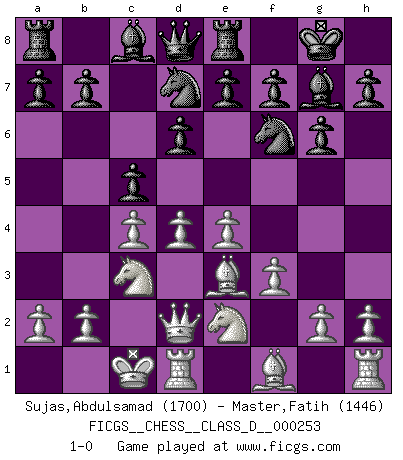 Last move : 1-0 2019 April 21 17:54:37 [Event "FICGS__CHESS__CLASS_D__000253"] [Site "FICGS"] [Date "2019.03.05"] [Round "1"] [White "Sujas,Abdulsamad"] [Black "Master,Fatih"] [Result "1-0"] [WhiteElo "1700"] [BlackElo "1446"] 1.c4 Nf6 2.d4 g6 3.Nc3 Bg7 4.e4 d6 5.f3 O-O 6.Be3 Nbd7 7.Qd2 Re8 8.O-O-O c5 9.Nge2 1-0 This chess game has been lost on time (started : 2019.03.05 8:6:54) English, 1...Nf6 (Anglo-Indian defense) Kingside Castling by player Black (move 5) Queenside Castling by player White (move 8) Player White won this chess game. Follow this game move after move (download)It is not enough to be a good player... you must also play well. (Siegbert Tarrasch) Es ist schade, dass viele Schachsportler vergessen, wie wichtig Auftreten und angemessene Kleidung sind. (Alexandra Kosteniuk) Tu eres para mi la Reina en d8 y yo soy el Peón en d7!!. (GM Eduard Gufeld) Ce qui est bien, c'est d'avoir tout un tas de pièces en prise : l'adversaire ne peut en prendre qu'une à la fois. Cité par Thierry Audin. In God we trust, all others we virus scan. (Anonymous)