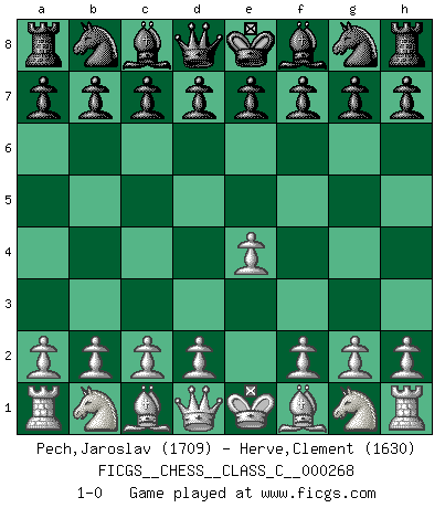 Last move : 1-0 2019 April 18 17:40:1 [Event "FICGS__CHESS__CLASS_C__000268"] [Site "FICGS"] [Date "2019.03.05"] [Round "1"] [White "Pech,Jaroslav"] [Black "Herve,Clement"] [Result "1-0"] [WhiteElo "1709"] [BlackElo "1630"] 1.e4 1-0 This chess game has been lost on time (started : 2019.03.05 8:7:6) King's pawn Opening Player White won this chess game. Follow this game move after move (download)All I want to do, ever, is just play Chess. (Bobby Fischer) Ich habe die Schachforschung dermaßen betrieben, dass sie auf eine wissenschaftliche Basis gestellt wurde. (Mikhail Moiseyevich Botvinik) Desconfianza es la característica mas necesaria de un jugador de Ajedrez. (Siegbert Tarrasch) L'action d'une oeuvre littéraire se déroule sur un champ de bataille. Les masques et les types du drame moderne correspondent aux pièces du jeu d'échecs. L'intrigue correspond aux coups et aux gambits, c'est à dire aux techniques du jeu telles qu'utilisées et interprétées par les joueurs. Les tactiques et les péripéties [mouvements] correspondent aux coups exécutés par l'adversaire. (Viktor Shklovsky) Experience is the name we all give to our mistakes. (Oscar Wilde)