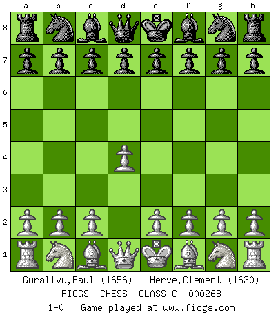 Last move : 1-0 2019 April 14 16:55:22 [Event "FICGS__CHESS__CLASS_C__000268"] [Site "FICGS"] [Date "2019.03.05"] [Round "1"] [White "Guralivu,Paul"] [Black "Herve,Clement"] [Result "1-0"] [WhiteElo "1656"] [BlackElo "1630"] 1.d4 1-0 This chess game has been lost on time (started : 2019.03.05 8:7:6) Queen's pawn Player White won this chess game. Follow this game move after move (download)A strong memory, concentration, imagination, and a strong will is required to become a great Chess player. (Bobby Fischer) Frage: Was machen Sie mit den Preisen? Anwort: Ich habe Angst, dass meine Freundin davon neue Kleider kauft. (Loek van Wely) Después de una mala apertura, hay una esperanza en el juego medio. Pero una vez que estas en finales, el momento de la verdad ha llegado. (Edmar Mednis) Mais n'est-ce pas déjà le limiter injurieusement que d'appeler les échecs un jeu? N'est-ce pas aussi une science, un art, ou quelque chose qui, comme le cercueil de Mahomet entre ciel et terre, est suspendu entre l'un et l'autre, et qui réunit un nombre incroyable de contraires ? (Stefan Zweig) The bottom line is always the bottom line. (Johann Piek)