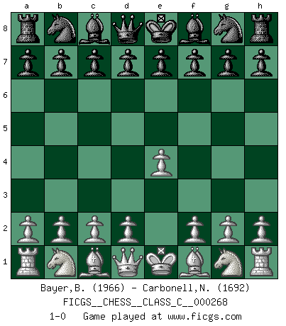 Last move : 1-0 2019 April 14 16:55:22 [Event "FICGS__CHESS__CLASS_C__000268"] [Site "FICGS"] [Date "2019.03.05"] [Round "1"] [White "Bayer,Bernhard"] [Black "Carbonell,Nicolas"] [Result "1-0"] [WhiteElo "1966"] [BlackElo "1692"] 1.e4 1-0 This chess game has been lost on time (started : 2019.03.05 8:7:6) King's pawn Opening Player White won this chess game. Follow this game move after move (download)A man that will take back a move at Chess will pick a pocket. (Richard Fenton) Die Leute spielen gegen mich seit 15 Jahren unter Ihren Möglichkeiten. (Robert James Fischer) Fischer es el jugador mas fuerte del mundo. De hecho, el jugador mas fuerte que jamas haya existido. (Larry Evans) Même si vous avez un bon coup à faire, regardez toujours s'il n'y en a pas un qui lui soit préférable. (Pedro Damiano) 98% of all statistics are made up. (Author unknown)