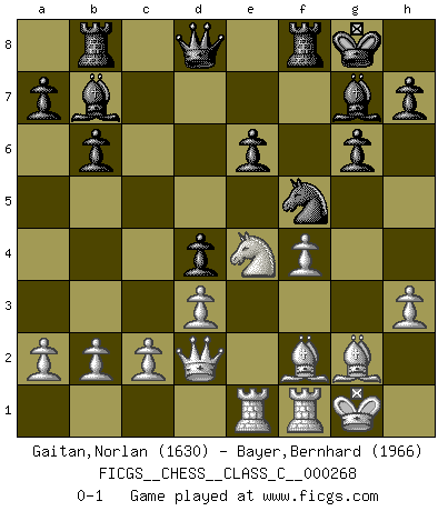 Last move : 0-1 2019 July 7 11:13:28 [Event "FICGS__CHESS__CLASS_C__000268"] [Site "FICGS"] [Date "2019.03.05"] [Round "1"] [White "Gaitan,Norlan"] [Black "Bayer,Bernhard"] [Result "0-1"] [WhiteElo "1630"] [BlackElo "1966"] 1.e4 c5 2.Nc3 Nc6 3.g3 g6 4.Bg2 d6 5.d3 Bg7 6.f4 e6 7.Nf3 Nge7 8.O-O O-O 9.Be3 b6 10.e5 Rb8 11.exd6 Nf5 12.Bf2 Nxd6 13.Qd2 Bb7 14.Rae1 Nd4 15.Nxd4 cxd4 16.Ne4 Nf5 17.g4 Nh6 18.h3 f5 19.gxf5 Nxf5 0-1 This chess game has been lost on time (started : 2019.03.05 8:7:6) Sicilian : Closed Kingside Castling by player White (move 8) Kingside Castling by player Black (move 8) Player Black won this chess game. Follow this game move after move (download)There just isn't enough televised Chess. (David Letterman) Kein Großmeister ist normal. Sie unterscheiden sich nur im Ausmaß Ihrer Verrücktheit. (Viktor Kortschnoi) No volvere nunca a jugar contigo. Has insultado a mi amigo. - cuando un oponente se maldijo por una mala jugada (Miguel Najdorf) Les écrivains ont utilisé les échecs pour analyser les côtés extrêmes de la nature humaine. Dans ce cadre, les échecs offrent un champ d'expérimentation idéal. Mais on pourrait faire la même chose avec la peinture. Et là, en vous référant à Van Gogh, vous ne tirerez pas de conclusion définitive sur les peintres. (Gary Kasparov) I don't believe in psychology. I believe in good moves. (Bobby Fischer)