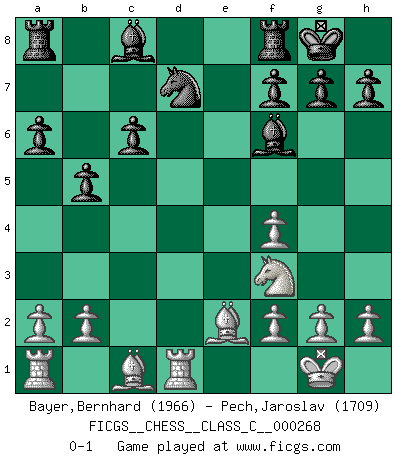 Last move : 0-1 2019 August 17 18:50:13 [Event "FICGS__CHESS__CLASS_C__000268"] [Site "FICGS"] [Date "2019.03.05"] [Round "1"] [White "Bayer,Bernhard"] [Black "Pech,Jaroslav"] [Result "0-1"] [WhiteElo "1966"] [BlackElo "1709"] 1.d4 d5 2.c4 c6 3.Nf3 Nf6 4.Nc3 e6 5.e3 Nbd7 6.Qc2 Bd6 7.Bd3 O-O 8.O-O dxc4 9.Bxc4 a6 10.Rd1 b5 11.Be2 Qc7 12.Ne4 Nxe4 13.Qxe4 e5 14.Qd3 exd4 15.Qxd4 Be7 16.Qf4 Qxf4 17.exf4 Bf6 0-1 This chess game has been lost on time (started : 2019.03.05 8:7:6) QGD Slav : 4.Nc3 Kingside Castling by player Black (move 7) Kingside Castling by player White (move 8) Player Black won this chess game. Follow this game move after move (download)Fischer is under obligation to nobody. (Joseph Platz) Woher wissen wir, daß der Neanderthaler Blindschach gespielt hat? -- Bei Ausgrabungen wurden keine Schachbretter und Figuren gefunden. (Anonymous) El poder defensivo de una pieza clavada, solamente es imaginario. (Aaron Nimzovich) RxDa4 pat (...) Wisdom doesn't necessarily come with age. Sometimes age just shows up all by itself. (Tom Wilson)