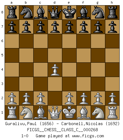 Last move : 1-0 2019 April 14 16:55:22 [Event "FICGS__CHESS__CLASS_C__000268"] [Site "FICGS"] [Date "2019.03.05"] [Round "1"] [White "Guralivu,Paul"] [Black "Carbonell,Nicolas"] [Result "1-0"] [WhiteElo "1656"] [BlackElo "1692"] 1.d4 1-0 This chess game has been lost on time (started : 2019.03.05 8:7:6) Queen's pawn Player White won this chess game. Follow this game move after move (download)Any material change in a position must come about by mate, a capture, or a Pawn promotion. (Purdy) Ich brauche nur einen Blick auf das Schachbrett zu werfen, und weiß schon, was in der Stellung steckt, was geschehen kann und was geschehen wird. Alle übrigen suchen und prüfen, ich aber weiß es! (José Raúl Capablanca) En manos de Fischer's, una diminuta ventaja teórica es tan buena como tener una Reina de ventaja. (Isaac Kashdan) Il vaut toujours mieux jouer un plan faux de façon logique que de n'avoir pas de plan du tout. (Victor Kortchnoï) There are 10 types of people in this world: those who understand binary and those who don't. (Anonymous)