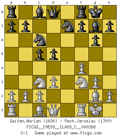 Last move : 0-1 2019 May 27 22:14:28 [Event "FICGS__CHESS__CLASS_C__000268"] [Site "FICGS"] [Date "2019.03.05"] [Round "1"] [White "Gaitan,Norlan"] [Black "Pech,Jaroslav"] [Result "0-1"] [WhiteElo "1630"] [BlackElo "1709"] 1.e4 c5 2.Nc3 Nc6 3.g3 g6 4.Bg2 Bg7 5.f4 e6 6.Nf3 d5 7.exd5 exd5 8.O-O Nge7 9.d3 O-O 0-1 This chess game has been lost on time (started : 2019.03.05 8:7:6) Sicilian : Closed Kingside Castling by player White (move 8) Kingside Castling by player Black (move 9) Player Black won this chess game. Follow this game move after move (download)A bad plan is better than none at all. (Frank Marshall) Alles was am Schachbrett zählt sind gute Züge. (Robert James Fischer) Debemos de asegurarnos de que el Ajedrez no se convierta en un lenguaje muerto, muy interesante, pero tan solo para un grupo muy pequeño. (Sytze Faber) 'L'échange des dames est un coup dur pour les deux adversaires...' Un journaliste lors d'une partie du match Spassky-Fischer Just because you do not take an interest in politics doesn't mean politics won't take an interest in you. (Pericles 430 B.C.)