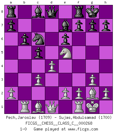 Last move : 1-0 2019 July 26 1:38:33 [Event "FICGS__CHESS__CLASS_C__000268"] [Site "FICGS"] [Date "2019.03.05"] [Round "1"] [White "Pech,Jaroslav"] [Black "Sujas,Abdulsamad"] [Result "1-0"] [WhiteElo "1709"] [BlackElo "1700"] 1.c4 c5 2.Nf3 Nc6 3.Nc3 Nf6 4.g3 d5 5.cxd5 Nxd5 6.Bg2 e6 7.O-O Be7 8.d4 Nxc3 9.bxc3 O-O 10.Rb1 b6 11.Ne5 1-0 This chess game has been lost on time (started : 2019.03.05 8:7:6) English : Symmetrical variation Kingside Castling by player White (move 7) Kingside Castling by player Black (move 9) Player White won this chess game. Follow this game move after move (download)You sit at the board and suddenly your heart leaps. Your hand trembles to pick up the piece and move it. But what Chess teaches you is that you must sit there calmly and think about whether it's really a good idea and whether there are other better ideas. (Stanley Kubrick) Karpov ist ein Museumsstück. (Garry Kasparov) Tu cuerpo tiene que estar en óptima condición. Tu Ajedrez se deteriora como lo hace tu cuerpo. No puedes separar la mente y el cuerpo. (Bobby Fischer) Les sacrifices démontrent seulement que quelqu'un a gaffé. (Savielly Tartacover) The greatest con, that he ever pulled... was making you believe... that he is you. (Revolver, movie)