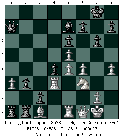 Last move : 0-1 2008 February 7 13:40:37 [Event "FICGS__CHESS__CLASS_B__000023"] [Site "FICGS"] [Date "2007.06.05"] [Round "1"] [White "Czekaj,Christophe"] [Black "Wyborn,Graham"] [Result "0-1"] [WhiteElo "2098"] [BlackElo "1890"] 1.d4 d5 2.Nf3 Nf6 3.e3 c5 4.b3 e6 5.Bd3 Nc6 6.O-O Be7 7.Bb2 O-O 8.Nbd2 b6 9.a3 Bb7 10.Qe2 Nd7 11.Ne5 Ndxe5 12.dxe5 a5 13.Qg4 a4 14.f4 g6 15.Rad1 Qc7 16.Rf2 Ba6 17.Bxa6 Rxa6 18.e4 d4 19.Rf3 b5 20.Rh3 Rb8 21.Qe2 Qa7 22.Qf2 c4 23.bxc4 bxc4 24.Bc1 c3 25.Nf3 Rab6 26.Ne1 Rb1 27.Rhd3 Ra1 28.Nf3 R8b1 29.Qf1 Na5 30.h4 Nb3 31.cxb3 c2 32.Re1 axb3 0-1 Queen's pawn game Kingside Castling by player White (move 6) Kingside Castling by player Black (move 7) Player Black won this chess game. Follow this game move after move (download)What is the difference between chess and football? Everybody understands football, but nobody plays it. Everybody plays chess, but nobody understands it. Everything is relative. (Vladimir Kramnik) Mutter, ich bin eben Ex-Weltmeister geworden. --beim nach Hause Kommen nach dem Verlust des WM-Titels an Mihail Botvinnik -- (Mikhail Nekhemyevich Tal) El Ajedrez es parte de la cultura, y si una cultura esta en decadencia, entonces también el Ajedrez declinará. (Mikhail Botvinnik) Aidez vos pièces, elles vous aideront. (Paul Morphy) We cannot be sure of having something to live for unless we are willing to die for it. (Ernesto Che Guevara)