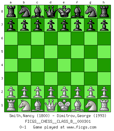 Last move : 0-1 2019 April 15 4:58:11 [Event "FICGS__CHESS__CLASS_B__000301"] [Site "FICGS"] [Date "2019.03.05"] [Round "1"] [White "Smith,Nancy"] [Black "Dimitrov,George"] [Result "0-1"] [WhiteElo "1800"] [BlackElo "1993"] 0-1 This chess game has been lost on time (started : 2019.03.05 22:35:29) Player Black won this chess game. Follow this game move after move (download)It is not a move, even the best move that you must seek, but a realizable plan. (Eugene Znosko-Borovsky) Im Schach gibt es keinen Platz für Galanterie. (Irving Chernev) La señal de un Gran Maestro es su habilidad de ganar una partida rápidamente y sin dolor. (Irving Chernev) L'action d'une oeuvre littéraire se déroule sur un champ de bataille. Les masques et les types du drame moderne correspondent aux pièces du jeu d'échecs. L'intrigue correspond aux coups et aux gambits, c'est à dire aux techniques du jeu telles qu'utilisées et interprétées par les joueurs. Les tactiques et les péripéties [mouvements] correspondent aux coups exécutés par l'adversaire. (Viktor Shklovsky) The beginning of wisdom is silence. The second step is listening. (Unknown)