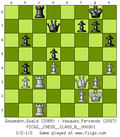 Last move : 1/2-1/2 2019 June 4 1:28:16 [Event "FICGS__CHESS__CLASS_B__000301"] [Site "FICGS"] [Date "2019.03.05"] [Round "1"] [White "Gossmann,Ewald"] [Black "Vasquez,Fernando"] [Result "1/2-1/2"] [WhiteElo "2089"] [BlackElo "2037"] 1.c4 e5 2.Nc3 Nf6 3.Nf3 Nc6 4.g3 Bb4 5.Bg2 O-O 6.O-O d6 7.Nd5 Bc5 8.e3 Bb6 9.d4 Bg4 10.h3 Bxf3 11.Bxf3 exd4 12.Nxb6 axb6 13.exd4 d5 14.cxd5 Nxd5 15.Re1 Qd7 16.Kg2 h6 17.b3 Nc3 18.Qc2 Nxa2 19.Qc4 Ncb4 20.Re5 c6 21.Bb2 b5 22.Qe2 Nd5 23.Bxd5 cxd5 24.Re7 Qc6 25.Qf3 b4 26.h4 b6 27.Qf5 Qc8 28.Qf3 Qc2 29.Re2 Qc6 30.Re7 Qd6 31.Re5 Qc7 32.Rae1 Qc2 33.R5e2 Qc6 34.Re5 Rac8 35.Ra1 Nc3 36.Rc1 Rc7 37.Re3 Re8 38.Rd3 Rec8 39.Bxc3 Qd7 40.Re3 Rxc3 41.Rexc3 1/2-1/2 English Opening Kingside Castling by player Black (move 5) Kingside Castling by player White (move 6) This chess game ended in a draw. Follow this game move after move (download)Chess is a forcing house where the fruits of character can ripen more fully than in life. (Edward Morgan Foster) Die Neutralität betrachte ich als eine schwere Krankheit. (Viktor Kortschnoi) Diferente gente reacciona diferentemente en aceptar la derrota. (Bobby Fischer) La vie et les Echecs sont tous les deux une lutte constante. (Lasker) The Internet isn't free. It just has an economy that makes no sense to capitalism. (Brad Shapcott)
