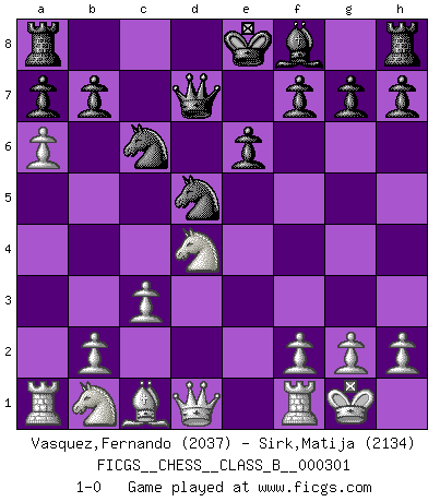 Last move : 1-0 2019 June 21 9:57:38 [Event "FICGS__CHESS__CLASS_B__000301"] [Site "FICGS"] [Date "2019.03.05"] [Round "1"] [White "Vasquez,Fernando"] [Black "Sirk,Matija"] [Result "1-0"] [WhiteElo "2037"] [BlackElo "2134"] 1.e4 c5 2.c3 Nf6 3.e5 Nd5 4.Nf3 Nc6 5.Bc4 Nb6 6.Bb3 d5 7.exd6 Qxd6 8.O-O Be6 9.Bxe6 Qxe6 10.a4 Qd7 11.a5 Nd5 12.d4 cxd4 13.Nxd4 e6 14.a6 1-0 Sicilian : Alapin's variation (2.c3) Kingside Castling by player White (move 8) Player White won this chess game. Follow this game move after move (download)What is the object of playing a gambit opening?... To acquire a reputation of being a dashing player at the cost of losing a game. (Siegbert Tarrasch) Immer nach dem besten Zug zu suchen ist ziemlich unpraktisch. (Nigel Short) Si yo gano un torneo, yo lo gano por mí mismo. Yo hago las jugadas. Nadie me ayuda. (Bobby Fischer) Donnez-moi un Cavalier en 6e et je gagnerais toutes mes parties. (Steinitz) The ego is not master in its own house. (Sigmund Freud)