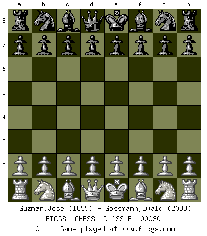 Last move : 0-1 2019 April 15 4:58:11 [Event "FICGS__CHESS__CLASS_B__000301"] [Site "FICGS"] [Date "2019.03.05"] [Round "1"] [White "Guzman,Jose"] [Black "Gossmann,Ewald"] [Result "0-1"] [WhiteElo "1859"] [BlackElo "2089"] 0-1 This chess game has been lost on time (started : 2019.03.05 22:35:29) Player Black won this chess game. Follow this game move after move (download)Chess is a cold bath for the mind. (Sir John Simon) Rubinstein ist ein Turmendspiel, welches die Götter vor tausenden von Jahren begannen. (Savielly Grigorievitsch Tartakower) Cuando veas una buena jugada, trata de encontrar otra mejor. (Emanuel Lasker) Il vaut toujours mieux jouer un plan faux de façon logique que de n'avoir pas de plan du tout. (Victor Kortchnoï) The absolute truth is the thing that makes people laugh. (Carl Reiner)