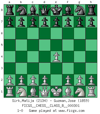 Last move : 1-0 2019 April 15 4:58:11 [Event "FICGS__CHESS__CLASS_B__000301"] [Site "FICGS"] [Date "2019.03.05"] [Round "1"] [White "Sirk,Matija"] [Black "Guzman,Jose"] [Result "1-0"] [WhiteElo "2134"] [BlackElo "1859"] 1.e4 1-0 This chess game has been lost on time (started : 2019.03.05 22:35:29) King's pawn Opening Player White won this chess game. Follow this game move after move (download)If one piece is badly posted, the whole game is bad. (Tarrasch) Vielleicht wirkt die Aura früherer Spieler glanzvoller als die der heutigen Spieler, aber das liegt daran, dass man kein Programm wie Fritz hatte, das einem all die Löcher in ihren Partien zeigt. (Vladimir Kramnik) Puntos débiles o agujeros en la posición de tu oponente deben de ser ocupados por piezas, no Peones. (Siegbert Tarrasch) Les échecs sont plus proches de l'art de l'assassinat que de l'art de la guerre. (Arturo Perez-Reverte) Knowledge will give you power, but character respect. (Bruce Lee)