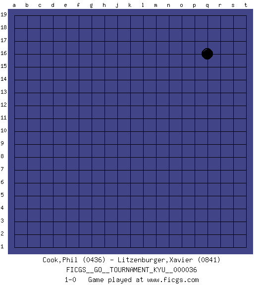 Last move : 1-0 2007 July 6 16:2:36 [Event "FICGS__GO__TOURNAMENT_KYU__000036"] [Site "FICGS"] [Date "2007.06.06"] [Round "1"] [Black "Cook,Phil"] [White "Litzenburger,Xavier"] [Result "1-0"] [Rating 1 "0436"] [Rating 2 "0841"] 1.q16 1-0 This go game has been lost on time (started : 2007.06.06 13:40:50) Here are the names of the openings (joseki) played in the four corners : Player Black won this Go (weiqi, baduk) game. Follow this game move after move (download)Don't make territory near thickness. (Anonymous) Creativity is inventing, experimenting, growing, taking risks, breaking rules, making mistakes, and having fun. (Mary Lou Cook)