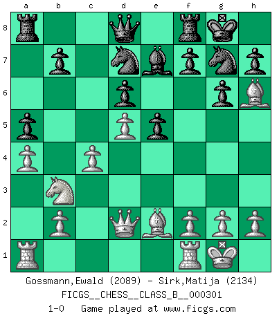 Last move : 1-0 2019 June 21 9:57:17 [Event "FICGS__CHESS__CLASS_B__000301"] [Site "FICGS"] [Date "2019.03.05"] [Round "1"] [White "Gossmann,Ewald"] [Black "Sirk,Matija"] [Result "1-0"] [WhiteElo "2089"] [BlackElo "2134"] 1.e4 c5 2.Nf3 d6 3.d4 cxd4 4.Nxd4 Nf6 5.Nc3 a6 6.Be3 e5 7.Nb3 Be6 8.Be2 Be7 9.Qd3 O-O 10.O-O Nbd7 11.Nd5 Bxd5 12.exd5 Ne8 13.a4 g6 14.c4 a5 15.Bh6 Ng7 16.Qd2 1-0 Sicilian : Najdorf, Byrne (English) attack Kingside Castling by player Black (move 9) Kingside Castling by player White (move 10) Player White won this chess game. Follow this game move after move (download)My style is somewhere between that of Tal and Petrosian. (Reshevsky) Ein Teil des Fehlers ist immer korrekt. (Savielly Grigorievitsch Tartakower) Si el Ajedrez es una ciencia, es la mas inexacta. Si el Ajedrez es un arte, es demasiado inexacto para ser visto como tal. Si el Ajedrez es un deporte, es demasiado esotérico. Si el Ajedrez es un juego, es demasiado exigente para ser solo un juego. Si el Ajedrez es una aventura, es una muy demandante. Si el Ajedrez es una pasión, es una muy gratificante. Si el Ajedrez es la vida, es una muy triste. (Anónimo) Shah mat. Le roi est mort. Cri de fierté d'un joueur venant de terrasser son adversaire, courtoisement, sans effusion de sang. This is where the fun begins. (Anakin Skywalker in Star Wars ep.3)