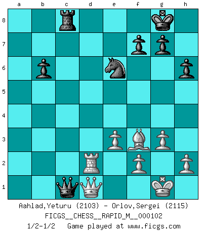 Last move : 1/2-1/2 2019 April 30 1:11:16 [Event "FICGS__CHESS__RAPID_M__000102"] [Site "FICGS"] [Date "2019.03.06"] [Round "1"] [White "Aahlad,Yeturu"] [Black "Orlov,Vladimir"] [Result "1/2-1/2"] [WhiteElo "2103"] [BlackElo "2115"] 1.c4 Nf6 2.d4 e6 3.Nf3 b6 4.g3 Ba6 5.b3 d5 6.Bg2 Bb4+ 7.Bd2 Be7 8.cxd5 exd5 9.Nc3 O-O 10.O-O Bb7 11.Qc2 Na6 12.a3 c5 13.Rfd1 Re8 14.Bf4 h6 15.dxc5 Nxc5 16.Qb2 Rc8 17.b4 Ne6 18.e3 a5 19.Be5 axb4 20.axb4 Rc4 21.Ra7 Qc8 22.Qa1 Rxb4 23.Nd4 Ng5 24.Nde2 Bc6 25.Rc7 Qe6 26.Nd4 Qxe5 27.Rxe7 Qxe7 28.Nxc6 Qf8 29.Nxb4 Qxb4 30.Nxd5 Nxd5 31.Rxd5 Ne6 32.Qd1 Rc8 33.Bf3 Qb2 34.Rd2 Qc1 1/2-1/2 English, 1...Nf6 (Anglo-Indian defense) Kingside Castling by player Black (move 9) Kingside Castling by player White (move 10) This chess game ended in a draw. Follow this game move after move (download)Chess is the art which expresses the science of logic. (Mikhail Botvinnik) Im Leben werden Partien nie so unstrittig gewonnen wie im Spiel (Emanuel Lasker) El Ajedrez es un terrible juego. Si no controlas el centro, tu oponente tiene una posición mas holgada. Si tienes control del centro, ¡entonces realmente tu tienes algo de que preocuparte!. (Siegbert Tarrasch) Aidez vos pièces, elles vous aideront. (Paul Morphy) Whenever people agree with me, I always feel I must be wrong. (Oscar Wilde)