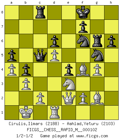 Last move : 1/2-1/2 2019 April 22 20:25:18 [Event "FICGS__CHESS__RAPID_M__000102"] [Site "FICGS"] [Date "2019.03.06"] [Round "1"] [White "Cirulis,Ilmars"] [Black "Aahlad,Yeturu"] [Result "1/2-1/2"] [WhiteElo "2188"] [BlackElo "2103"] 1.e4 c5 2.Nf3 d6 3.d4 cxd4 4.Nxd4 Nf6 5.Nc3 a6 6.Be3 e5 7.Nb3 Be6 8.Be2 Be7 9.g4 h6 10.h4 b5 11.a4 b4 12.Nd5 Nbd7 13.Bf3 a5 14.Qe2 Nh7 15.Nd2 Bxh4 16.Rxh4 Bxd5 17.Rxh6 gxh6 18.exd5 Qc7 19.Nc4 Rg8 20.O-O-O Ng5 21.b3 Rg6 22.Rh1 Rb8 23.Bg2 Kf8 24.Kb1 Nf6 25.Rd1 e4 26.Bf4 Rd8 27.Ne3 Qc5 28.Qf1 Rc8 29.Qe2 1/2-1/2 Sicilian : Najdorf, Byrne (English) attack Queenside Castling by player White (move 20) This chess game ended in a draw. Follow this game move after move (download)I prefer to lose a really good game than to win a bad one. (David Levy) Jede Eröffnung ist gut genug um gespielt zu werden, wenn nur ihr Ruf schlecht genug ist. (Savielly Grigorievitsch Tartakower) En el Ajedrez, cuando menos, el valiente hereda la tierra. (Edmar Mednis) RxDa4 pat (...) Without enthusiasm, virtue functions not at all, and vice only poorly. (Mignon McLaughlin, The Neurotic's Notebook, 1960)