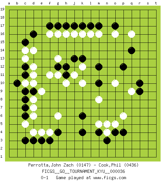 Last move : 0-1 2007 September 19 2:52:59 [Event "FICGS__GO__TOURNAMENT_KYU__000036 "] [Site "FICGS"] [Date "2007.06.06"] [Round "1"] [Black "Perrotta,John Zach "] [White "Cook,Phil "] [Result "0-1"] [Rating 1 "0147"] [Rating 2 "0436"] 1.c3 c5 2.p4 q16 3.o17 p6 4.d16 d14 5.c15 c14 6.q14 f16 7.f17 g16 8.g17 h16 9.h17 j16 10.j17 k16 11.k17 l16 12.l17 m16 13.m17 o16 14.k4 d8 15.r10 q9 16.r9 n4 17.n3 o5 18.o4 m5 19.m4 n5 20.c11 d10 21.c9 c10 22.b10 d11 23.c12 d12 24.d9 e9 25.c8 d7 26.c7 d6 27.c6 d4 28.m12 k10 29.m10 m8 30.g4 g6 31.d3 e4 32.e3 f4 33.f3 c13 34.j13 j11 35.k6 k12 36.k13 o10 37.p12 g13 38.h12 g11 39.h11 h10 40.g12 f11 0-1 This go game has been lost on time (started : 2007.06.06 13:40:50) Here are the names of the openings (joseki) played in the four corners : Corner d4 : c3 c5San-San (Sam-Sam, San-San) 3-3 Point. The San-San (3-3) point, emphasizing territory at the expense of influence.Ikken Kakari (Hankan Keolch'im, Yi Gua`, Jiao~, 1-Space Approach). Black may continue by playing 4-5, 3-5, 4-6, 3-6 or 5-4. Corner q16 : q16 o17Hoshi (Hwajeom, Seongjeom, Xingwei`) 4-4 Point. The star or hoshi (4-4) point, emphasizing influence at the potential expense of territory.Ikken Kakari (Hankan Keolch'im, Yi Gua`jiao~, 1-Space Low Approach). Black 2 is the standard approach move to the 4-4. Corner q4 : p4 p6Takamoku (Gomok, Gaomu`) 5-4 Point. The takamoku (high) point (5-4). With its emphasis on influence, the 5-4 point complements the 4-4 (hoshi) point in creating an influence-oriented fuseki. Corner d16 : d16 d14Hoshi (Hwajeom, Seongjeom, Xingwei`) 4-4 Point. The star or hoshi (4-4) point, emphasizing influence at the potential expense of territory.Ikken Takagakari (Hankan Nop'dakeolch'im, Yi Gaojia, 1-Space High Approach). Black typically responds at 6-4 or 3-10. Black 4-10 is played when Black finds play on the right side advantageous. Black 4-8 or 3-8 may be played when Black has support at top. Player White won this Go (weiqi, baduk) game.Follow this game move after move (download ) Answer the keima with a kosumi. (Anonymous) SEO proverb : Make your website optimized for human beings, not for search engines.