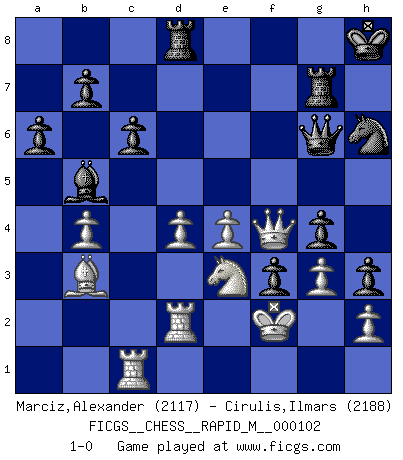 Last move : 1-0 2019 March 26 16:54:14 [Event "FICGS__CHESS__RAPID_M__000102"] [Site "FICGS"] [Date "2019.03.06"] [Round "1"] [White "Marciz,Alexander"] [Black "Cirulis,Ilmars"] [Result "1-0"] [WhiteElo "2117"] [BlackElo "2188"] 1.d4 f5 2.g3 Nf6 3.Bg2 d5 4.c4 c6 5.Qc2 e6 6.Nh3 Bd6 7.O-O O-O 8.Bf4 Be7 9.Nd2 h6 10.Bxb8 Rxb8 11.Nf4 Bd6 12.Nd3 Qe7 13.Nf3 Bd7 14.Rfb1 g5 15.e3 Be8 16.b4 Rf7 17.a4 a6 18.Qb2 Rg7 19.cxd5 exd5 20.Nfe5 h5 21.Bh3 Ng4 22.Re1 Kh8 23.f3 Nh6 24.Re2 h4 25.e4 dxe4 26.fxe4 f4 27.Bf5 Bxe5 28.Nxe5 g4 29.Qd2 Qd6 30.Rd1 f3 31.R2e1 Qf6 32.Qf4 Rd8 33.Kf2 Bh5 34.Nc4 Bf7 35.Ne3 Bb3 36.Rd3 Bxa4 37.Rh1 h3 38.Rc1 Bb5 39.Rd2 Qg5 40.Be6 Qg6 41.Bb3 1-0 Alexander Marciz Thanks for the party! Very soon you will be proud of her. Dutch defense Kingside Castling by player White (move 7) Kingside Castling by player Black (move 7) Player White won this chess game. Follow this game move after move (download)A chess genius has died; a loss for humanity. (Viktor Kortchnoi, about Bobby Fischer's death) Ich moechte nie einem Club beitreten, der Leute wie mich als Mitglieder aufnimmt. (Woody Allen) Una clavada es mas poderosa que una espada. (Fred Reinfeld) La guerre est enfant de la passion, la passion est enfant du narcissisme et le narcissisme est l'enfant. (...) Une autre partie ? (Thibault de Vassal) Fame, I have already. Now I need the money. (an elderly Steinitz)