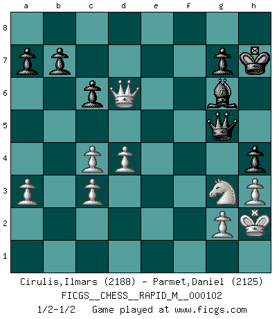Last move : 1/2-1/2 2019 April 2 12:24:29 [Event "FICGS__CHESS__RAPID_M__000102"] [Site "FICGS"] [Date "2019.03.06"] [Round "1"] [White "Cirulis,Ilmars"] [Black "Parmet,Daniel"] [Result "1/2-1/2"] [WhiteElo "2188"] [BlackElo "2125"] 1.c4 e5 2.Nc3 Bb4 3.a3 Bxc3 4.bxc3 d6 5.e4 f5 6.exf5 Bxf5 7.d3 Nf6 8.Ne2 Nc6 9.Ng3 Bg6 10.Be2 O-O 11.O-O Qd7 12.f4 exf4 13.Bxf4 Rae8 14.Bg5 Qe6 15.Qd2 h6 16.Bxf6 Rxf6 17.Rxf6 Qxf6 18.Bf3 Ne5 19.Bd5+ Kh8 20.d4 Ng4 21.Re1 Rxe1+ 22.Qxe1 c6 23.Bf3 Qg5 24.Bxg4 Qxg4 25.h3 Qg5 26.Kh2 Kh7 27.Qe6 h5 28.Qxd6 h4 1/2-1/2 English, Kramnik-Shirov counterattack Kingside Castling by player Black (move 10) Kingside Castling by player White (move 11) This chess game ended in a draw. Follow this game move after move (download)I'm not afraid of Spassky. The world knows I'm the best. You don't need a match to prove it. (Bobby Fischer) Ich hatte Angst gegen einen russischen Großmeister zu verlieren, und er befürchtete gegen einen kleinen Jungen zu verlieren. (über ein Remis gegen Juri Awerbach). (Robert James Fischer) El Ajedrez es realmente noventa y nueve por ciento calculación. (Soltis) Assurément je connaissais par expérience le mystérieux attrait de ce jeu royal, le seul entre tous les jeux inventés par les hommes qui échappe souverainement à la tyrannie du hasard, le seul où l'on ne doive sa victoire qu'à son intelligence ou plutôt à une certaine forme d'intelligence. Mais n'est-ce pas déjà le limiter injurieusement que d'appeler les échecs un jeu ? N'est-ce pas une science, un art ou quelque chose qui, comme le cercueil de Mahomet entre ciel et terre, est suspendu entre l'un et l'autre, et qui réunit un nombre incroyable de contraires ? [...] C'est une pensée qui ne mène à rien, une mathématique qui n'établit rien, un art qui ne laisse pas d'uvre, une architecture sans matière; et il l'a prouvé néanmoins qu'il était plus durable, à sa manière, que les livres ou que tout autre monument, ce jeu unique qui appartient à tous les peuples et à tous les temps, et dont personne ne sait quel dieu en fit don à la terre pour tuer l'ennui, pour aiguiser l'esprit et stimuler l'âme. Où commence-t-il, où finit-il ? (Stefan Zweig) That's absurd. I love it. (Gregory House, House M.D.)