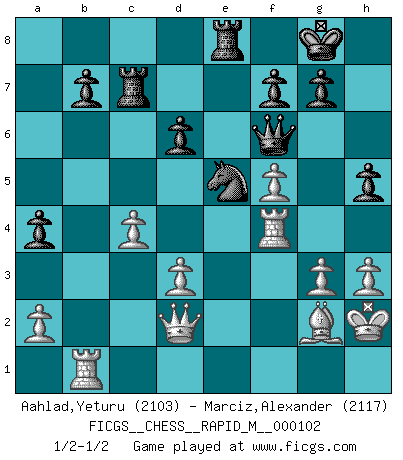 Last move : 1/2-1/2 2019 April 12 7:21:19 [Event "FICGS__CHESS__RAPID_M__000102"] [Site "FICGS"] [Date "2019.03.06"] [Round "1"] [White "Aahlad,Yeturu"] [Black "Marciz,Alexander"] [Result "1/2-1/2"] [WhiteElo "2103"] [BlackElo "2117"] 1.c4 e5 2.Nc3 Nf6 3.Nf3 Nc6 4.g3 Bb4 5.Bg2 O-O 6.Nd5 d6 7.Nxb4 Nxb4 8.O-O c5 9.d3 h6 10.b3 Rb8 11.Bb2 Re8 12.Nd2 Bg4 13.h3 Bh5 14.Nf3 Bg6 15.Kh2 Nc6 16.Rc1 Qe7 17.Qd2 a5 18.Bc3 Ra8 19.Nh4 Bh7 20.e4 Nd7 21.f4 exf4 22.Rxf4 a4 23.b4 cxb4 24.Bxb4 Nxb4 25.Qxb4 Ne5 26.Qd2 Rac8 27.Nf5 Bxf5 28.exf5 Qf6 29.Rb1 Rc7 30.Rb4 h5 31.Rb1 1/2-1/2 English Opening Kingside Castling by player Black (move 5) Kingside Castling by player White (move 8) This chess game ended in a draw. Follow this game move after move (download)Chess is the gymnasium of the mind. (Blaise Pascal) Kasparov ist eine Art Monster mit hundert Augen, denen auch nicht das Geringste entgeht. (Tony Miles) Todos los Maestros de Ajedrez fueron un día unos principiantes. (Chernev) L'ordinateur a tué l'originalité. Il n'y a plus guère d'aventures sur l'échiquier. (Jacob Murray) You have to believe in yourself. (Sun Tzu)
