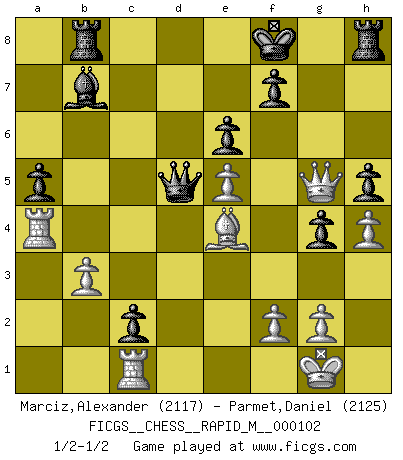 Last move : 1/2-1/2 2019 March 15 16:49:24 [Event "FICGS__CHESS__RAPID_M__000102"] [Site "FICGS"] [Date "2019.03.06"] [Round "1"] [White "Marciz,Alexander"] [Black "Parmet,Daniel"] [Result "1/2-1/2"] [WhiteElo "2117"] [BlackElo "2125"] 1.d4 d5 2.Nf3 Nf6 3.c4 c6 4.Nc3 e6 5.Bg5 h6 6.Bh4 dxc4 7.e4 g5 8.Bg3 b5 9.h4 g4 10.Ne5 Nbd7 11.Be2 Bb7 12.Nxd7 Qxd7 13.Be5 Qe7 14.b3 Rg8 15.Qc2 Nd7 16.Bg3 b4 17.Na4 c3 18.a3 a5 19.O-O h5 20.e5 Bh6 21.Rfd1 Rh8 22.Bc4 Rd8 23.Qe4 Kf8 24.Bd3 Rb8 25.Bf4 Bxf4 26.Qxf4 c5 27.Nxc5 Nxc5 28.dxc5 bxa3 29.Rxa3 Qxc5 30.Qf6 Kg8 31.Ra4 c2 32.Rc1 Qd5 33.Qg5+ Kf8 34.Be4 1/2-1/2 Queen's pawn game Kingside Castling by player White (move 19) This chess game ended in a draw. Follow this game move after move (download)By the beauty of his games, the clarity of his play, and the brilliance of his ideas, Fischer made himself an artist of the same stature as Brahms, Rembrandt, and Shakespeare. (David Levy) Ein Remis kann durch Wiederholung von drei Zügen oder durch einen schlechte Zug erreicht werden. (Savielly Grigorievitsch Tartakower) Yo siempre he tenido un ligero sentimiento de lástima por una persona que no tiene conocimiento del Ajedrez. (Siegbert Tarrasch) En blitz, le Cavalier l'emporte sur le Fou. (Vlastimil Hort) History is the quarrels of popes and kings, with wars or pestilences in every page; the men all so good for nothing, and hardly any women at all. (Jane Austen)