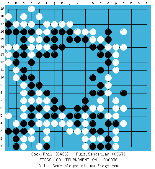 Last move : 0-1 2007 September 10 9:23:22 [Event "FICGS__GO__TOURNAMENT_KYU__000036 "] [Site "FICGS"] [Date "2007.06.06"] [Round "1"] [Black "Cook,Phil "] [White "Ruiz,Sebastian "] [Result "0-1"] [Rating 1 "0436"] [Rating 2 "0567"] 1.d4 q4 2.d16 q16 3.o4 q6 4.o6 j3 5.q8 p7 6.o16 q14 7.k4 j4 8.j5 k3 9.m4 f16 10.h16 f14 11.h14 m16 12.f13 e14 13.e13 d14 14.d12 c6 15.d6 d7 16.e6 f4 17.f5 g4 18.g5 h5 19.h6 h4 20.k6 e4 21.d5 c5 22.d8 c8 23.d9 c9 24.d10 e7 25.f8 f7 26.g7 e8 27.e9 f6 28.g6 c7 29.c10 e5 30.c4 b4 31.b3 a5 32.e3 f3 33.e2 f2 34.f1 d3 35.c3 d2 36.d1 e1 37.e2 c2 38.b2 c1 39.e3 e1 40.b1 o8 41.m8 o10 42.m10 n15 43.n11 p11 44.n13 o14 45.o12 p12 46.l15 l16 47.k15 k16 48.j15 g17 49.g13 h17 50.g16 e16 51.e17 f17 52.c14 d13 53.c13 d15 54.c15 d17 55.c16 c17 56.b16 b17 57.a17 e18 58.n14 m15 59.m14 n7 60.l7 n6 61.o13 p13 62.n9 o9 63.o7 o5 64.g14 l4 65.k5 l5 66.m5 m6 67.l6 l3 68.n5 p5 69.n8 p6 70.m3 m2 71.n3 n2 72.o2 p3 73.o15 p14 74.f15 e15 75.g15 b10 76.c11 b11 77.j16 j17 78.a3 a14 79.a16 b14 80.b13 a13 81.b12 a12 82.b18 c18 83.c19 d19 84.b19 a18 85.a19 a18 86.n1 l2 87.m1 l1 88.o1 p2 89.p4 p1 0-1 Here are the names of the openings (joseki) played in the four corners : Corner q4 : q4 o4Hoshi (Hwajeom, Seongjeom, Xingwei`) 4-4 Point. The star or hoshi (4-4) point, emphasizing influence at the potential expense of territory.Ikken Takagakari (Hankan Nop'dakeolch'im, Yi Gaojia, 1-Space High Approach). White typically responds at 6-4 or 3-10. White 4-10 is played when White finds play on the right side advantageous. White 4-8 or 3-8 may be played when White has support at top. Corner d4 : d4 j3Hoshi (Hwajeom, Seongjeom, Xingwei`) 4-4 Point. The star or hoshi (4-4) point, emphasizing influence at the potential expense of territory. Corner q16 : q16 o16Hoshi (Hwajeom, Seongjeom, Xingwei`) 4-4 Point. The star or hoshi (4-4) point, emphasizing influence at the potential expense of territory.Ikken Takagakari (Hankan Nop'dakeolch'im, Yi Gaojia, 1-Space High Approach). White typically responds at 6-4 or 3-10. White 4-10 is played when White finds play on the right side advantageous. White 4-8 or 3-8 may be played when White has support at top. Corner d16 : d16 f16Hoshi (Hwajeom, Seongjeom, Xingwei`) 4-4 Point. The star or hoshi (4-4) point, emphasizing influence at the potential expense of territory.Ikken Takagakari (Hankan Nop'dakeolch'im, Yi Gaojia, 1-Space High Approach). Black typically responds at 6-4 or 3-10. Black 4-10 is played when Black finds play on the right side advantageous. Black 4-8 or 3-8 may be played when Black has support at top. Player White won this Go (weiqi, baduk) game.Follow this game move after move (download ) On the third line, four die, six live. (Anonymous) Memory is a complicated thing, a relative to truth, but not its twin. (Barbara Kingsolver, Animal Dreams)