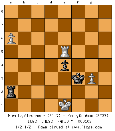 Last move : 1/2-1/2 2019 June 27 0:14:0 [Event "FICGS__CHESS__RAPID_M__000102"] [Site "FICGS"] [Date "2019.03.06"] [Round "1"] [White "Marciz,Alexander"] [Black "Kerr,Graham"] [Result "1/2-1/2"] [WhiteElo "2117"] [BlackElo "2239"] 1.d4 d5 2.Nf3 Nf6 3.c4 c6 4.Nc3 e6 5.Bg5 h6 6.Bh4 dxc4 7.e4 g5 8.Bg3 b5 9.Be2 Bb7 10.O-O Nbd7 11.Ne5 Bg7 12.Nxd7 Nxd7 13.Bd6 a6 14.a4 b4 15.Bxb4 Qb6 16.Ba3 Qxd4 17.Qc2 c5 18.Rad1 Qe5 19.Bxc4 Qc7 20.Ne2 Be5 21.Kh1 O-O 22.b3 Rfd8 23.Ng3 Nf6 24.Rde1 Rd7 25.Bb2 Rad8 26.Bc3 h5 27.f3 h4 28.Ne2 Kh7 29.Nc1 Bxc3 30.Qxc3 Nh5 31.Nd3 Nf4 32.Nf2 Rd4 33.Kg1 Kg6 34.Rc1 f6 35.Rc2 a5 36.Bb5 e5 37.g3 hxg3 38.hxg3 Ne6 39.Kg2 Rh8 40.Bc4 Qb6 41.Rfc1 Ba6 42.Bxe6 Qxe6 43.Qxa5 g4 44.Qc3 Bb7 45.Rh1 Rxh1 46.Kxh1 gxf3 47.Qxf3 Rb4 48.Rc3 f5 49.Kh2 Bxe4 50.Nxe4 fxe4 51.Qe3 Qg4 52.Kg2 Rd4 53.Rc4 Kf5 54.Qf2+ Qf3+ 55.Qxf3+ exf3+ 56.Kxf3 Rd3+ 57.Kf2 Rxb3 58.a5 Rb2+ 59.Kf1 e4 60.a6 Ra2 61.Rxc5+ Kg4 62.Re5 Kf3 63.Ke1 1/2-1/2 Queen's pawn game Kingside Castling by player White (move 10) Kingside Castling by player Black (move 21) 10 pieces endgame at move 55 : White KRPPP , Black KRPPP WHITE : King + 1 Rook 3 Pawns BLACK : King + 1 Rook 3 Pawns 9 pieces endgame at move 56 : White KRPPP , Black KRPP WHITE : King + 1 Rook 3 Pawns BLACK : King + 1 Rook 2 Pawns 8 pieces endgame at move 57 : White KRPP , Black KRPP WHITE : King + 1 Rook 2 Pawns BLACK : King + 1 Rook 2 Pawns 7 pieces endgame at move 61 : White KRPP , Black KRP WHITE : King + 1 Rook 2 Pawns BLACK : King + 1 Rook 1 Pawn This chess game ended in a draw. Follow this game move after move (download)The way he plays Chess demonstrates a man's whole nature. (Stanley Ellin) Schach ist eine Sache der genauen Beurteilung, wann man zuschlagen und wann man sich ducken muss. (Robert James Fischer) Una partida de Ajedrez se divide en 3 etapas: la primera cuando piensas que tienes la ventaja, la segunda cuando crees que tienes la ventaja y la tercera... ¡cuando te das cuenta que vas a perder!. (Savielly Tartakower) Comme les marins qui ont mille raisons différentes d'aller en mer, les joueurs d'échecs en ont tout autant avant de s'installer devant une table et jouer... (Vincent Bertignac, philosophe) Difficult things take a long time, impossible things a little longer. (Author unknown)