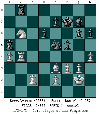 Last move : 1/2-1/2 2019 July 13 15:28:11 [Event "FICGS__CHESS__RAPID_M__000102"] [Site "FICGS"] [Date "2019.03.06"] [Round "1"] [White "Kerr,Graham"] [Black "Parmet,Daniel"] [Result "1/2-1/2"] [WhiteElo "2239"] [BlackElo "2125"] 1.d4 Nf6 2.c4 g6 3.Nc3 Bg7 4.g3 O-O 5.Nf3 d6 6.Bg2 Nc6 7.O-O a6 8.d5 Na5 9.b3 Rb8 10.Bd2 c5 11.dxc6 Nxc6 12.Rc1 Bf5 13.Nd5 Be4 14.Nc3 Bf5 15.Bg5 Ne4 16.Nxe4 Bxe4 17.Qd2 Re8 18.Rfd1 Qa5 19.Qxa5 Nxa5 20.Rd2 Nc6 21.Be3 f5 22.h4 Rbc8 23.Bh3 Ne5 24.Ng5 Bc6 25.Ne6 Bf6 26.Nf4 Be4 27.Nd5 Bg7 28.Bg2 Bxg2 29.Kxg2 Ng4 30.Bg5 Kf7 31.Rcd1 Rc6 32.f3 Ne5 33.Rb1 b5 34.cxb5 axb5 35.a4 bxa4 36.bxa4 h6 37.Bf4 Rc5 38.Rb4 Ra5 39.Be3 Rea8 40.Nb6 Rb8 41.Rc2 1/2-1/2 Graham Kerr gg, thanks ;-) King's Indian defense, 3.Nc3 Kingside Castling by player Black (move 4) Kingside Castling by player White (move 7) This chess game ended in a draw. Follow this game move after move (download)Is Bobby Fischer quite sane ? (Salo Flohr) Ich suche im Schach immer etwas Eigenes. Riskantes Spiel im Stile schachlicher Musketiere ist nicht meine Sache, auch wenn es vielen Freunden scharfer Wendungen gefällt. (Anatoly Karpov) Si yo gano un torneo, yo lo gano por mí mismo. Yo hago las jugadas. Nadie me ayuda. (Bobby Fischer) Karpov est une pièce de musée. (Garry Kasparov) The Internet is the world's largest library. It's just that all the books are on the floor. (John Allen Paulos)
