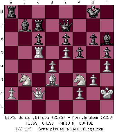 Last move : 1/2-1/2 2019 June 4 22:34:16 [Event "FICGS__CHESS__RAPID_M__000102"] [Site "FICGS"] [Date "2019.03.06"] [Round "1"] [White "Cleto Junior,Dirceu"] [Black "Kerr,Graham"] [Result "1/2-1/2"] [WhiteElo "2226"] [BlackElo "2239"] 1.d4 d5 2.c4 c6 3.Nf3 Nf6 4.Nc3 e6 5.Bg5 h6 6.Bxf6 Qxf6 7.e3 Nd7 8.Bd3 dxc4 9.Bxc4 g6 10.O-O Bg7 11.e4 Qe7 12.e5 O-O 13.Re1 b5 14.Bd3 Bb7 15.Be4 Rfd8 16.Qe2 Nb6 17.Rac1 Rac8 18.Nb1 Nc4 19.Rc2 h5 20.h4 Bh6 21.Nc3 Nb6 22.Nb1 a5 23.Nbd2 a4 24.g3 Kg7 25.Rd1 Rc7 26.Kh2 Nd5 27.Rc5 Nb6 28.Rdc1 Nc4 29.R1xc4 bxc4 30.Qxc4 Kg8 31.Bd3 f5 32.b4 axb3 33.Nxb3 Ra8 34.Qc2 1/2-1/2 QGD Slav : 4.Nc3 Kingside Castling by player White (move 10) Kingside Castling by player Black (move 12) This chess game ended in a draw. Follow this game move after move (download)Excellence at Chess is one mark of a scheming mind. (Sir Arthur Conan Doyle) Ich würde mich als ganz normalen Jungen bezeichnen [Im Alter von 12]. (Sergej Karjakin) Cuando tengas duda... ¡juega al Ajedrez!. (Tevis) La vie est comme un jeu d'échecs : nous esquissons un plan, mais celui-ci est tributaire de ce que daignent faire l'adversaire aux échecs et le destin dans la vie. (Arthur Schopenhauer) Man is reluctant to give credit for intelligence to anyone, except his enemies. (Albert Einstein)