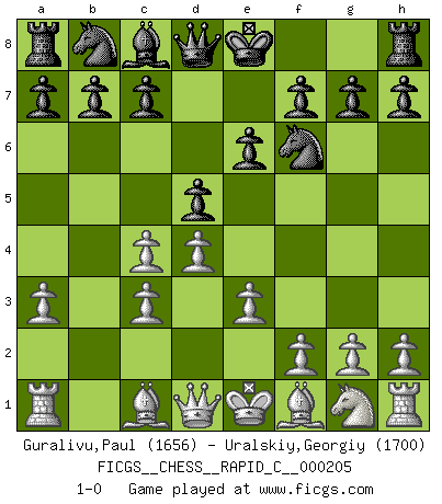 Last move : 1-0 2019 April 17 13:1:39 [Event "FICGS__CHESS__RAPID_C__000205"] [Site "FICGS"] [Date "2019.03.11"] [Round "1"] [White "Guralivu,Paul"] [Black "Uralskiy,Georgiy"] [Result "1-0"] [WhiteElo "1656"] [BlackElo "1700"] 1.d4 d5 2.c4 e6 3.Nc3 Bb4 4.e3 Nf6 5.a3 Bxc3+ 6.bxc3 1-0 QGD : 3.Nc3 Player White won this chess game. Follow this game move after move (download)Chess holds its master in its own bonds, shackling the mind and brain so that the inner freedom of the very strongest must suffer. (Albert Einstein) Kleine Schachspieler machen Mist, und große Schachspieler machen Mist, aber große machen weniger Mist. (Fritz Sämisch) Una clavada es mas poderosa que una espada. (Fred Reinfeld) Le jeu d'échecs est comme rejeté hors du temps. (Antoine de Saint-Exupéry) When you stop learning you start dying. (Scott Adams)