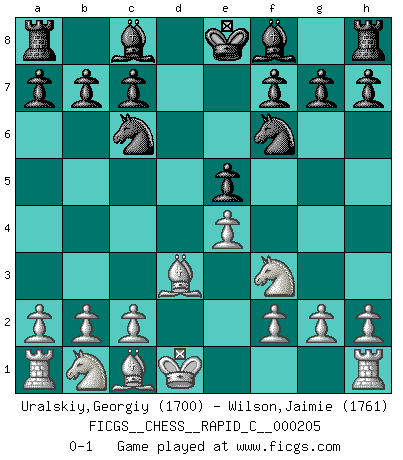 Last move : 0-1 2019 April 20 5:50:57 [Event "FICGS__CHESS__RAPID_C__000205"] [Site "FICGS"] [Date "2019.03.11"] [Round "1"] [White "Uralskiy,Georgiy"] [Black "Wilson,Jaimie"] [Result "0-1"] [WhiteElo "1700"] [BlackElo "1761"] 1.d3 d5 2.e4 dxe4 3.dxe4 Qxd1+ 4.Kxd1 e5 5.Nf3 Nf6 6.Bd3 Nc6 0-1 This chess game has been lost on time (started : 2019.03.11 9:1:18) Mieses Opening Player Black won this chess game. Follow this game move after move (download)Kasparov : J'adoube , Ivanchuk : S'il vous plaît ! (Garry Kasparov & Vassily Ivanchuk, Linares 1997) Die meiste Zeit treffe ich auf Gegner, die meine Enkel sein könnten. Ich bin da, um ihnen zu zeigen, dass sie von mir noch einiges lernen können. (Viktor Kortschnoi) Algunos sacrificios son sólidos, los demás son mÃos. (Mikhail Tal) Des points faibles ou des trous dans la position de l'adversaire doivent être occupés par des pièces et non pas par des pions. (Siegbert Tarrasch) The leaves of memory seemed to make a mournful rustling in the dark. (Henry Wadsworth Longfellow)