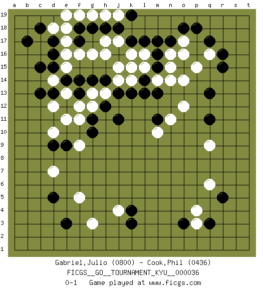 Last move : 0-1 2007 October 9 18:7:40 [Event "FICGS__GO__TOURNAMENT_KYU__000036"] [Site "FICGS"] [Date "2007.06.06"] [Round "1"] [Black "Gabriel,Julio"] [White "Cook,Phil"] [Result "0-1"] [Rating 1 "0800"] [Rating 2 "0436"] 1.q3 p4 2.r5 q6 3.d16 f16 4.d5 d14 5.q17 o17 6.r15 f5 7.e3 g3 8.o3 p3 9.o15 n15 10.q11 q9 11.k4 j4 12.k3 o14 13.m16 l16 14.c15 d7 15.d9 d10 16.c13 d12 17.k17 k16 18.m15 o16 19.f17 h16 20.h18 p15 21.l17 k14 22.m13 m14 23.l14 n14 24.l13 l15 25.n17 n16 26.m17 o12 27.j16 k15 28.k13 j15 29.h14 j17 30.j18 g16 31.f14 e15 32.d13 e17 33.f18 e18 34.d17 e16 35.j13 f19 36.g18 d18 37.c18 e13 38.e14 g19 39.o18 q16 40.r16 h19 41.p18 j19 42.k19 e19 43.b17 g13 44.g14 h13 45.h12 j14 46.f13 g12 47.g11 f12 48.e12 f11 49.j11 e11 50.g10 e13 51.d15 h17 52.e9 f9 53.m11 n11 54.q13 m10 0-1 This go game has been lost on time (started : 2007.06.06 13:40:50) Here are the names of the openings (joseki) played in the four corners : Corner q4 : q3 p4 Komoku (Somok, Xiao~mu`) 3-4 Point. The komoku (3-4) point is the traditional corner enclosure move.. Corner d16 : d16 f16 Hoshi (Hwajeom, Seongjeom, Xingwei`) 4-4 Point. The star or hoshi (4-4) point, emphasizing influence at the potential expense of territory. Ikken Takagakari (Hankan Nop'dakeolch'im, Yi Gaojia, 1-Space High Approach). Black typically responds at 6-4 or 3-10. Black 4-10 is played when Black finds play on the right side advantageous. Black 4-8 or 3-8 may be played when Black has support at top. Corner q16 : q17 o17 Komoku (Somok, Xiao~mu`) 3-4 Point. The komoku (3-4) point is the traditional corner enclosure move.. Corner d4 : d5 f5 Takamoku (Gomok, Gaomu`) 5-4 Point. The takamoku (high) point (5-4). With its emphasis on influence, the 5-4 point complements the 4-4 (hoshi) point in creating an influence-oriented fuseki. Player White won this Go (weiqi, baduk) game. Follow this game move after move (download)Atari, atari is vulgar play. (Anonymous) God is an atheist. (Unknown)