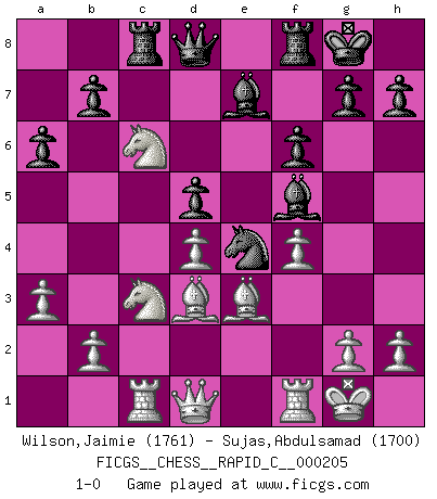 Last move : 1-0 2019 May 13 20:28:55 [Event "FICGS__CHESS__RAPID_C__000205"] [Site "FICGS"] [Date "2019.03.11"] [Round "1"] [White "Wilson,Jaimie"] [Black "Sujas,Abdulsamad"] [Result "1-0"] [WhiteElo "1761"] [BlackElo "1700"] 1.c4 e6 2.Nf3 Nf6 3.Nc3 d5 4.e3 c5 5.cxd5 exd5 6.d4 Nc6 7.Be2 Be7 8.O-O O-O 9.Ne5 Be6 10.f4 cxd4 11.exd4 Bf5 12.Be3 Rc8 13.Rc1 a6 14.a3 Ne4 15.Bd3 f6 16.Nxc6 1-0 This chess game has been lost on time (started : 2019.03.11 9:1:18) English Opening Kingside Castling by player White (move 8) Kingside Castling by player Black (move 8) Player White won this chess game. Follow this game move after move (download)One doesn't have to play well, it's enough to play better than your opponent. (Siegbert Tarrasch) Es war undenkbar für die Behörden, dass ein sowjetischer Großmeister auf diese Art und Weise [Fischer-Taimanov 6:0] verliert, ohne dass es eine politischer Erklärung dafür gäbe. (Mark Taimanov) Realmente no sabemos como el juego fue inventado, aunque hay sospechas. Tan pronto como descubramos a los culpables, se los haremos saber. (Bruce Pandolfini) Les Cavaliers se révèlent fort utiles dans les positions fermées. D'habitude, les Fous sont un peu plus forts que les Cavaliers dans les positions ouvertes. Qu'on le veuille ou non, il restera toujours des exceptions ! Patience, use the Force, think ! (Obi-Wan Kenobi in Star Wars ep.2)