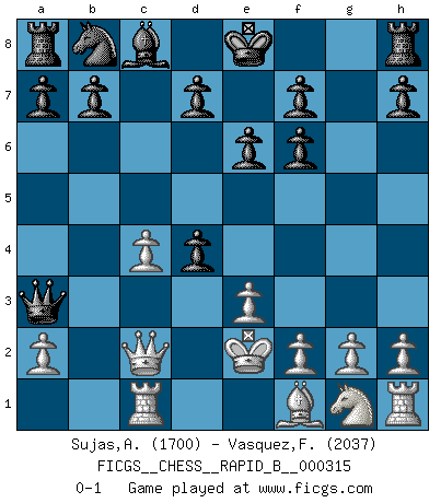 Last move : 0-1 2019 May 4 7:17:3 [Event "FICGS__CHESS__RAPID_B__000315"] [Site "FICGS"] [Date "2019.03.12"] [Round "1"] [White "Sujas,Abdulsamad"] [Black "Vasquez,Fernando"] [Result "0-1"] [WhiteElo "1700"] [BlackElo "2037"] 1.d4 Nf6 2.c4 e6 3.Nc3 Bb4 4.Bg5 c5 5.e3 Qa5 6.Bxf6 Bxc3+ 7.Ke2 gxf6 8.bxc3 Qxc3 9.Rc1 Qa3 10.Qc2 cxd4 0-1 This chess game has been lost on time (started : 2019.03.12 16:26:30) Nimzo-Indian : Leningrad variation Player Black won this chess game. Follow this game move after move (download)Adequate compensation for a sacrifice is having a sound combination leading to a winning position; adequate compensation for a blunder is having your opponent snatch defeat from the jaws of victory. (Bruce A. Moon) Über die Verhaftung Bobby Fischers: Warum es die Bush-Administration für nötig befindet einen 61 Jahre alten Mann zu hetzten, der für niemanden ausser sich selbste eine Gefahr darstellt ist ein Rätsel. (Nigel Short) La esencia del Ajedrez es pensar acerca de lo que el Ajedrez es. (David Bronstein) Tout change constamment, y compris dans le monde des Echecs. (Botvinnik) The ultimate in disposing one's troops is to be without ascertainable shape. Then the most penetrating spies cannot pry in nor can the wise lay plans against you. (Sun Tzu)