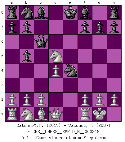 Last move : 0-1 2019 May 8 7:33:22 [Event "FICGS__CHESS__RAPID_B__000315"] [Site "FICGS"] [Date "2019.03.12"] [Round "1"] [White "Satonnet,Patrick"] [Black "Vasquez,Fernando"] [Result "0-1"] [WhiteElo "2019"] [BlackElo "2037"] 1.e4 e5 2.Nf3 Nf6 3.Nxe5 d6 4.Nc4 Nxe4 5.d4 d5 6.Ne3 Qf6 7.Bb5+ c6 8.O-O cxb5 9.Nxd5 Qc6 0-1 This chess game has been lost on time (started : 2019.03.12 16:26:30) Petrov : Paulsen attack Kingside Castling by player White (move 8) Player Black won this chess game. Follow this game move after move (download)Pawns: they are the soul of this game, they alone form the attack and defense. (Philidor) Wenn Schach ein enormer Dschungel ist, der seine Myriaden von Geheimnissen nicht preisgeben will, dann sind Computer die Kettensägen einer gewaltigen ökologisch unsensiblen Nutzholzfirma. (Nigel Short) Alekhine es un poeta que crea un trabajo de arte de algo que raramente inspiraría a otra persona a mandar una tarjeta postal. (Max Euwe) Les Echecs représentent une sphère d'idées créatrices basée sur la volonté des deux protagonistes. (Smyslov) Gambling : The sure way of getting nothing from something. (Wilson Mizner)