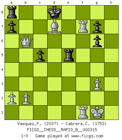 Last move : 1-0 2019 May 10 3:57:36 [Event "FICGS__CHESS__RAPID_B__000315"] [Site "FICGS"] [Date "2019.03.12"] [Round "1"] [White "Vasquez,Fernando"] [Black "Cabrera,Claudio"] [Result "1-0"] [WhiteElo "2037"] [BlackElo "1753"] 1.e4 c5 2.c3 d5 3.exd5 Qxd5 4.d4 Nc6 5.Nf3 Bg4 6.Be2 e6 7.h3 Bh5 8.c4 Qd6 9.d5 exd5 10.g4 Bg6 11.cxd5 Nb4 12.Qa4+ Kd8 13.O-O h5 14.g5 Ne7 15.Nc3 Nc8 16.Be3 Nb6 17.Qa5 Nc2 18.Nb5 Qd7 19.Bf4 Qxh3 20.Ne5 Nd4 21.Rae1 Nxb5 22.Bxb5 Bd6 23.Bd7 Qh4 24.Nxg6 fxg6 25.Bxd6 Qxg5+ 26.Bg3 h4 27.Re5 Qf6 28.Re6 Qd4 29.Rxb6 hxg3 30.Rxb7 Ke7 31.Qe1+ Kf8 32.Be6 Rh5 33.Rf7+ Ke8 34.d6 Qxd6 35.fxg3 Re5 36.Bd7+ Kd8 37.Qa5+ Qb6 38.Qxb6+ 1-0 Sicilian : Alapin's variation (2.c3) Kingside Castling by player White (move 13) Player White won this chess game. Follow this game move after move (download)Becoming successful at Chess allows you to discover your own personality. That's what I want for the kids I teach. (Saudin Robovic) Die unerbitterlichsten Regeln im Schach sind die Ausnahmen. (Savielly Grigorievitsch Tartakower) Una victoria por una combinación errónea, aunque sea espectacular, me llena de horror artístico. (Wilhelm Steinitz) Même si l'adversaire joue le coup analysé précédemment, recommencez l'analyse en voyant la nouvelle position. Première règle de Blumenfeld Programmer - an organism that turns coffee into software. (Anonymous)