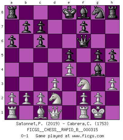 Last move : 0-1 2019 April 20 17:52:25 [Event "FICGS__CHESS__RAPID_B__000315"] [Site "FICGS"] [Date "2019.03.12"] [Round "1"] [White "Satonnet,Patrick"] [Black "Cabrera,Claudio"] [Result "0-1"] [WhiteElo "2019"] [BlackElo "1753"] 1.e4 e5 2.Nf3 Nc6 3.Bb5 a6 4.Bxc6 dxc6 5.O-O Bg4 6.h3 h5 7.d3 Qf6 8.Nbd2 g5 0-1 This chess game has been lost on time (started : 2019.03.12 16:26:30) Ruy Lopez : Exchange variation, Alapin gambit Kingside Castling by player White (move 5) Player Black won this chess game. Follow this game move after move (download)My style is somewhere between that of Tal and Petrosian. (Reshevsky) Es ist besser die Steine des Gegners zu opfern. (Savielly Grigorievitsch Tartakower) Las combinaciones han sido siempre el aspecto más intrigante del Ajedrez. Los Maestros las buscan, el público las aplauden, los críticos las alaban. La razón se debe a que las combinaciones hacen posible que el Ajedrez sea más que un ejercicio matemático con una carencia de vida. Ellas son la poesía del juego, son del Ajedrez lo que la melodía es de la música. Ellas representan el triunfo de la mente sobre la materia. (Reuben Fine) Mon pion favori sur ma case favorite ! Bronstein en parlant d'un coup de pion en h5 quand il avait les Noirs. I think your argument is specious - I think your tie is ugly. (Gregory House to Dr. Foreman, House M.D.)