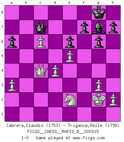 Last move : 1-0 2019 April 16 7:16:38 [Event "FICGS__CHESS__RAPID_B__000315"] [Site "FICGS"] [Date "2019.03.12"] [Round "1"] [White "Cabrera,Claudio"] [Black "Trigance,Emile"] [Result "1-0"] [WhiteElo "1753"] [BlackElo "1798"] 1.c4 c5 2.g3 Nc6 3.Bg2 g6 4.Nc3 Bg7 5.e3 e6 6.Nge2 Nge7 7.d4 cxd4 8.exd4 d5 9.O-O O-O 10.cxd5 Nxd5 11.Be3 Nxe3 12.fxe3 a6 13.Qd2 Qg5 14.Ne4 Qe7 15.Rac1 Rd8 16.Nc5 Rb8 17.Nxa6 bxa6 18.Bxc6 Bb7 19.Rfd1 Qd6 20.Bxb7 Rxb7 21.Qc3 Rdb8 22.b3 Qd5 23.Rc2 Bf8 24.Qd3 Bh6 25.e4 Qd6 26.e5 Qb6 27.Kg2 Rd8 28.Qf3 Rc7 29.Rc4 Rdc8 30.Rf1 Rf8 31.a3 Rxc4 32.bxc4 Qc7 33.c5 Bg7 34.Rb1 Rb8 35.Rxb8+ Qxb8 36.c6 Qb6 37.Qc3 Qc7 38.Qc4 1-0 English : Symmetrical variation Kingside Castling by player White (move 9) Kingside Castling by player Black (move 9) Player White won this chess game. Follow this game move after move (download)I look one move ahead... the best ! (Siegbert Tarrasch) Ich möchte Schüler heranbilden, die das Vermögen haben, selbst zu denken und Kritik zu üben. (Emanuel Lasker) El Rey es una pieza de pelea. ¡Usenlo!. (Wilhelm Steinitz) Roi des jeux et jeu des rois, les échecs portent en eux un sentiment d'infini. Ils donnent à celui qui s'est efforcé d'en approfondir les arcanes l'impression de n'être pas à la mesure de l'homme; en fait, ils constituent un résumé de l'univers, un microcosme, et figurent cette grande échelle qui, dans les plans de la lumière descend jusqu'à la matière, qui des abîmes insondables remonte jusqu'en l'infini de Dieu. (Pyrame) Everything in life is luck. (Donald Trump)