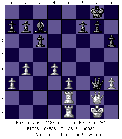 Last move : 1-0 2019 June 4 7:56:56 [Event "FICGS__CHESS__CLASS_E__000220"] [Site "FICGS"] [Date "2019.03.12"] [Round "1"] [White "Hadden,John"] [Black "Wood,Brian"] [Result "1-0"] [WhiteElo "1291"] [BlackElo "1284"] 1.d4 d5 2.c4 e6 3.cxd5 exd5 4.Nc3 c6 5.Nf3 Nf6 6.Bg5 Bd6 7.e3 O-O 8.Bd3 Bg4 9.h3 Bxf3 10.Qxf3 Nbd7 11.O-O h6 12.Bxf6 Nxf6 13.Rfe1 Re8 14.a3 Bc7 15.b4 Qd6 16.g3 Re6 17.Re2 Rae8 18.Rae1 Ne4 19.Bxe4 dxe4 20.Qg2 Rg6 21.Nxe4 Rxe4 22.Qxe4 Rxg3+ 23.fxg3 Qxg3+ 24.Qg2 1-0 Queen's gambit declined Kingside Castling by player Black (move 7) Kingside Castling by player White (move 11) Player White won this chess game. Follow this game move after move (download)There must have been a time when men were demigods, or they could not have invented Chess. (Gustav Schenk) Das typische an einem Großmeister ist, daß er eine gewonnene Position schnell und schmerzlos gewinnt. (Irving Chernev) Aquellos que dicen que entienden al Ajedrez, no entienden nada. (Robert Hubner) Il s'avisa de me proposer d'apprendre les échecs qu'il jouait un peu... me voilà forcené des échecs. J'achète un échiquier, je m'enferme dans ma chambre, j'y passe des jours et des nuits à vouloir apprendre par cur toutes les parties. (Jean-Jacques Rousseau, Confessions) Whatever you do, don't be bored. This is absolutely the most exciting time we could have possibly hoped to be alive. And things are just starting. (From movie Waking life)