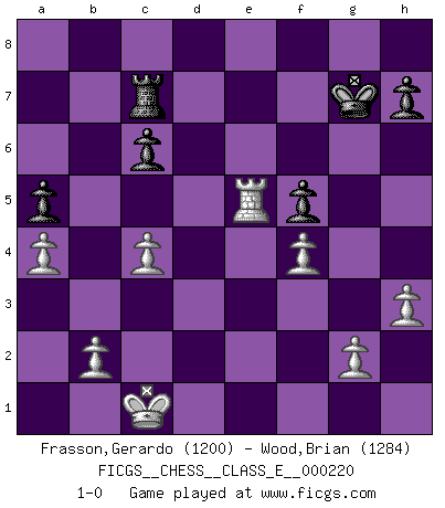 Last move : 1-0 2019 May 29 6:55:31 [Event "FICGS__CHESS__CLASS_E__000220"] [Site "FICGS"] [Date "2019.03.12"] [Round "1"] [White "Frasson,Gerardo"] [Black "Wood,Brian"] [Result "1-0"] [WhiteElo "1200"] [BlackElo "1284"] 1.e4 e5 2.Nc3 Nc6 3.Nf3 Bc5 4.Bb5 a6 5.Ba4 d6 6.d4 exd4 7.Bxc6+ bxc6 8.Nxd4 Nf6 9.Bg5 Bxd4 10.Qxd4 O-O 11.O-O-O Be6 12.e5 dxe5 13.Qxe5 Qe8 14.Qxc7 Qc8 15.Qe5 Bc4 16.Bxf6 gxf6 17.Qxf6 Qe6 18.Qxe6 Bxe6 19.Rhe1 Rfd8 20.a4 Rxd1+ 21.Rxd1 Kf8 22.Ne4 Kg7 23.h3 Bd5 24.Rd4 Bxe4 25.Rxe4 f5 26.Re6 Rc8 27.f4 Rc7 28.c4 a5 29.Re5 1-0 Vienna game, Max Lange defense Kingside Castling by player Black (move 10) Queenside Castling by player White (move 11) Player White won this chess game. Follow this game move after move (download)That's what Chess is all about. One day you give your opponent a lesson, the next day he gives you one. (Bobby Fischer) Die Auseinandersetzung mit Karpow war politisch geprägt. Er stand für das kommunistische System, wurde von dessen Repräsentanten gehätschelt. Ich war der Oppositionelle. Jeder Schachweltmeister spiegelt auch die gesellschaftlichen Verhältnisse wider. Kramnik steht für die Börsen-Generation des Neuen Markts, ideologiefrei, zahlenfixiert. (Garry Kasparov) El Ajedrez es parte de la cultura, y si una cultura esta en decadencia, entonces también el Ajedrez declinará. (Mikhail Botvinnik) Les Echecs sont affaire de jugement sensible. Savoir quand frapper et quand esquiver. (Fischer) All the biggest technological inventions created by man - the airplane, the automobile, the computer - says little about his intelligence, but speaks volumes about his laziness. (Mark Kennedy)