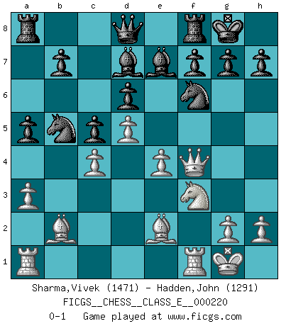 Last move : 0-1 2019 July 8 11:45:41 [Event "FICGS__CHESS__CLASS_E__000220"] [Site "FICGS"] [Date "2019.03.12"] [Round "1"] [White "Sharma,Vivek"] [Black "Hadden,John"] [Result "0-1"] [WhiteElo "1471"] [BlackElo "1291"] 1.e4 e5 2.f4 exf4 3.Nf3 Nc6 4.Bd3 d6 5.O-O Be6 6.c4 Be7 7.b4 Nxb4 8.Be2 Nf6 9.Nc3 O-O 10.Bb2 a6 11.d4 a5 12.a3 Na6 13.Qd2 c5 14.Qxf4 Nc7 15.d5 Bd7 16.Nb5 Nxb5 0-1 This chess game has been lost on time (started : 2019.03.12 23:12:11) King's knight's gambit Kingside Castling by player White (move 5) Kingside Castling by player Black (move 9) Player Black won this chess game. Follow this game move after move (download)During a Chess competition a Chessmaster should be a combination of a beast of prey and a monk. (Alexander Alekhine) Ich verachte Kasparow. (Viktor Kortschnoi) Bobby es la celebridad menos entendida y malinterpretada que camina el la faz de esta tierra. (Yasser Seirawan) Ce qui caractérise les parties de combat, c'est que si le défenseur a constamment de difficiles problèmes à résoudre, l'attaquant doit chercher sans relâche de nouvelles possibilités d'attaque. (Koblentz) Once you start thinking you have nothing left to learn, you have everything to learn. (Steve Badget)