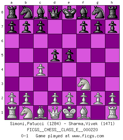 Last move : 0-1 2019 May 8 7:33:22 [Event "FICGS__CHESS__CLASS_E__000220"] [Site "FICGS"] [Date "2019.03.12"] [Round "1"] [White "Simoni,Patucci"] [Black "Sharma,Vivek"] [Result "0-1"] [WhiteElo "1284"] [BlackElo "1471"] 1.Nf3 d5 2.c4 e5 0-1 This chess game has been lost on time (started : 2019.03.12 23:12:11) Reti Opening Player Black won this chess game. Follow this game move after move (download)In Fischer's hands, a slight theoretical advantage is as good a being a Queen ahead. (Isaac Kashdan) Über die Verhaftung Bobby Fischers: Warum es die Bush-Administration für nötig befindet einen 61 Jahre alten Mann zu hetzten, der für niemanden ausser sich selbste eine Gefahr darstellt ist ein Rätsel. (Nigel Short) Los Peones son nacidos libres, y aún así, se encuentran por doquier encadenados. (Rick Kennedy) Même si l'adversaire joue le coup analysé précédemment, recommencez l'analyse en voyant la nouvelle position. Première règle de Blumenfeld It is a good thing for an uneducated man to read books of quotations. (Winston Churchill)