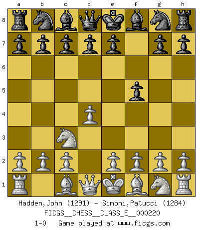 Last move : 1-0 2019 May 12 8:19:48 [Event "FICGS__CHESS__CLASS_E__000220"] [Site "FICGS"] [Date "2019.03.12"] [Round "1"] [White "Hadden,John"] [Black "Simoni,Patucci"] [Result "1-0"] [WhiteElo "1291"] [BlackElo "1284"] 1.d4 f5 2.Nc3 1-0 This chess game has been lost on time (started : 2019.03.12 23:12:11) Dutch Player White won this chess game. Follow this game move after move (download)It is difficult to play against Einstein's theory --on his first loss to Fischer. (Mikhail Tal) Frage: Wie viele Autos haben Sie schon zerstört? - Antwort: Nur zwei. (Loek van Wely) Un entendimiento minucioso de las típicas continuaciones de mate hacen de las mas complicadas combinaciones de sacrificio que conducen hacia ellas no solo no dificiles, sino casi un asunto de rutina. (Siegbert Tarrasch) Je ne suis pas le dernier à jouer lâchement des coups douteux pendant le zeïtnot de l'adversaire pour l'achever: en effet les coups qui font le plus peur sont ceux que l'on ne comprend pas. Je me fais souvent peur quand je joue. (Un professeur anonyme) The leaves of memory seemed to make a mournful rustling in the dark. (Henry Wadsworth Longfellow)